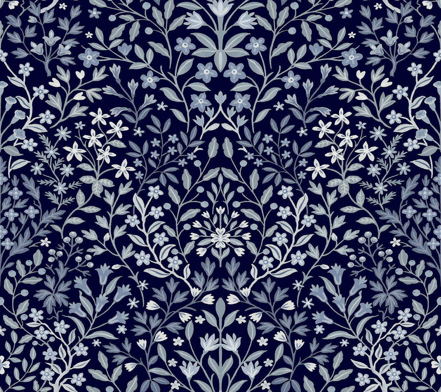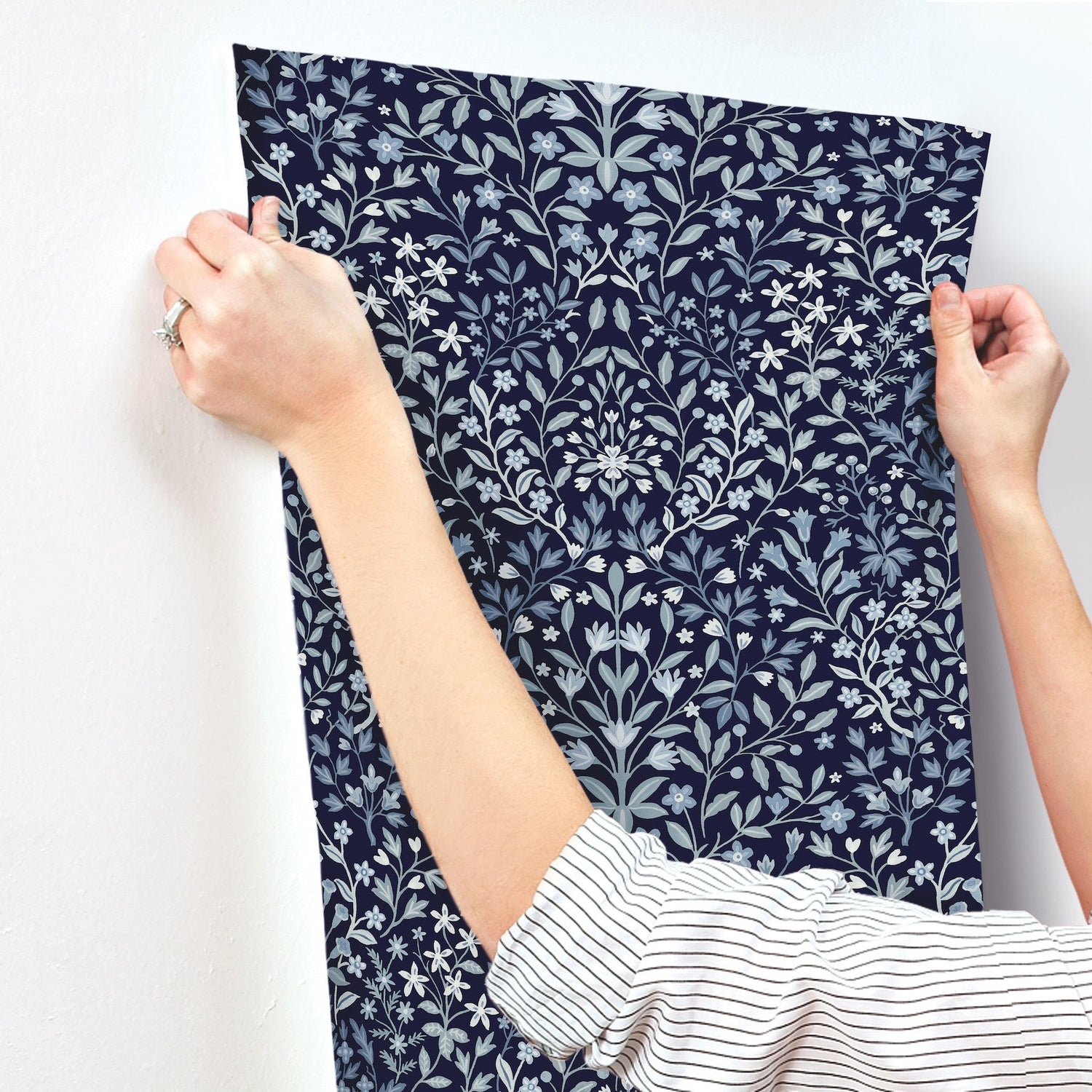 Wildflowers bloom amid vines lined with berries and foliage, putting nature on display in playful, curved waves. Featuring a palette of rich, monochromatic blues. This Garden Terrace Wallpaper measures approximately 27 inches wide by 27 feet long, measuring approximately 60.8 square feet per roll. This collection of timeless wallcoverings is layered with warmth and charm, and effortlessly blends nostalgic patterns with modern designs. This assortment has a little bit of everything—simple stripes, subtle plaids, vintage motifs, and bold florals.