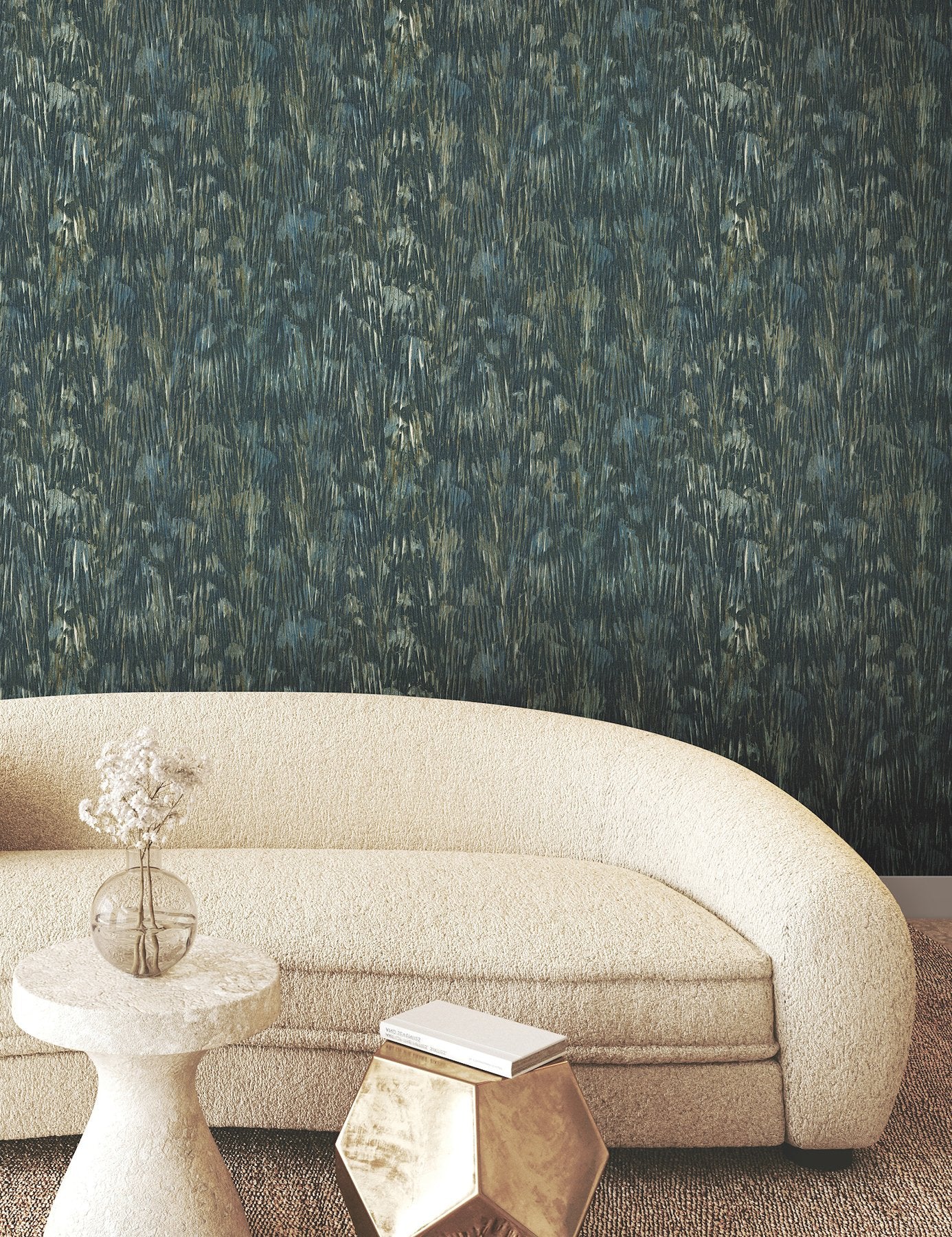 Inspired by the textured layers of feather and down, Gilded Plume is rich with natural dimension and features a dark teal, pale blue, and golden taupe palette accented by brushes of gold. This Gilded Plume Wallpaper measures approximately 20.8 inches wide by 33 feet long, measuring approximately 57.2 square feet per roll. Textural, organic forms grounded in earthly inspiration.