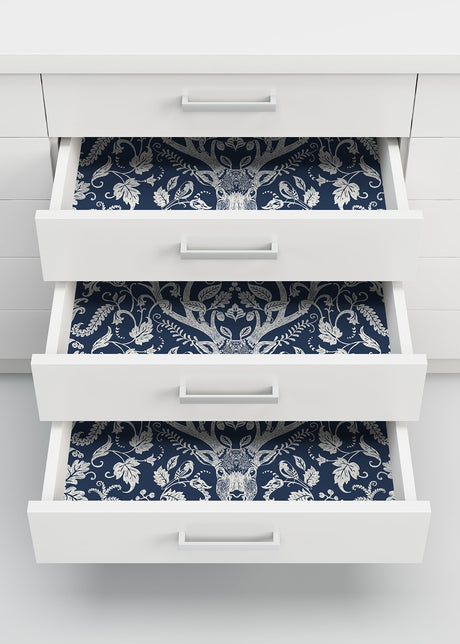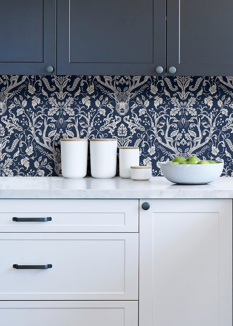 Aya White Peel & Stick Wallpaper with Navy Botanical Motif - NuWallpaper NU2683