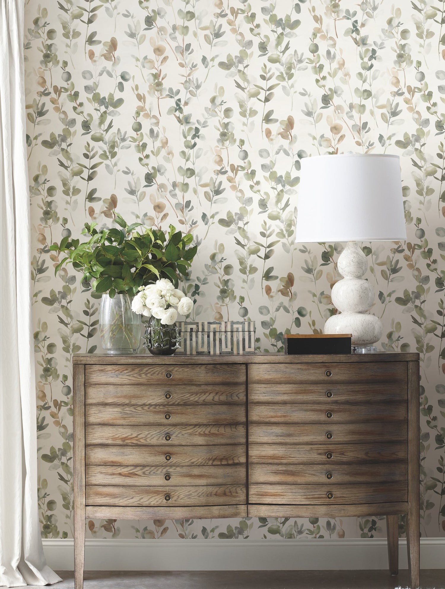 Detailed Name: Candice Olson Joyful Eucalpytus Green Wallpaper, 27-in by 27-ft