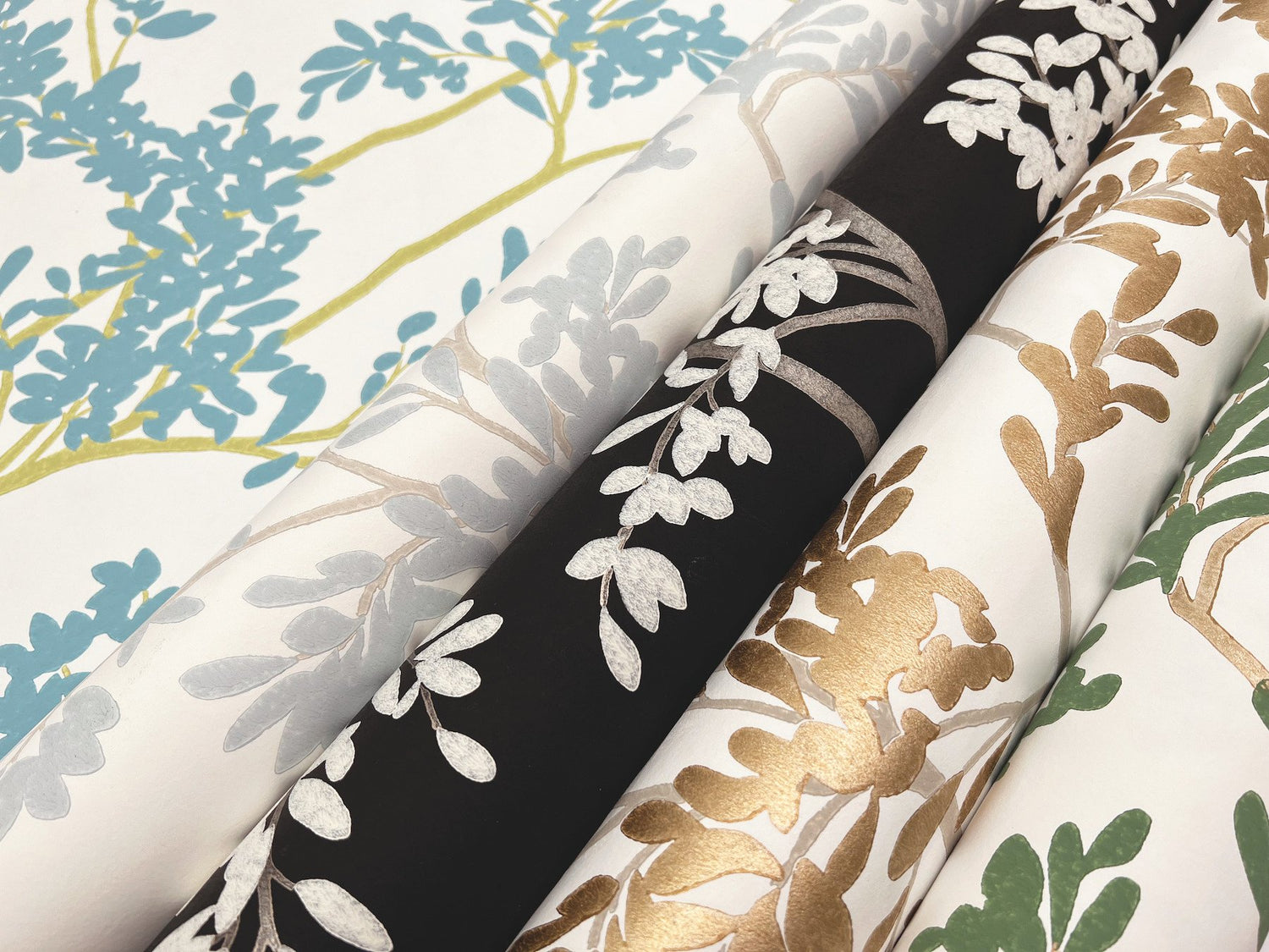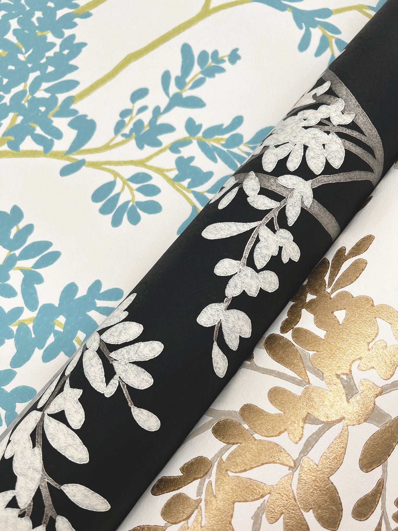 Spindly branches laden with delicate yet densely-packed leaves climb forever upwards in pattern Lunaria Silhouette in gold and white. This Lunaria Silhouette Wallpaper measures approximately 27 inches wide by 27 feet long, measuring approximately 60.8 square feet per roll. Florals speak the language of ever-evolving style with instant connection and iconic form that confidently compliments any space and every design signature.