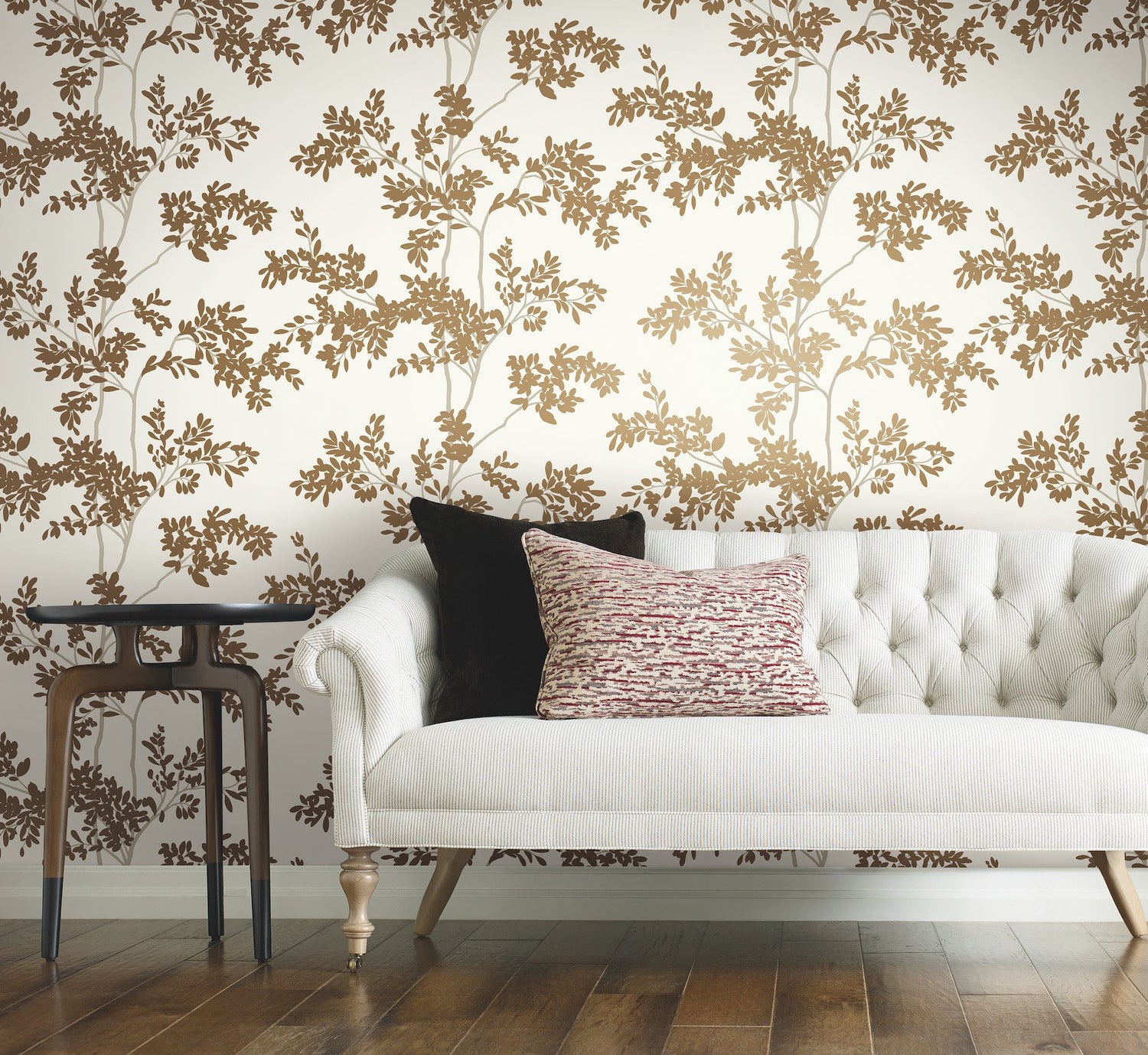 Lunaria Silhouette White & Gold Wallpaper with Botanical Branch Motif - York BL1806 - Roll is backordered and will ship as soon as it is back in stock.