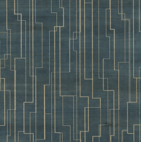 Inlay Line Peacock Blue Wood Veneer Wallpaper with Metallic Geometric Lines - York GV0258