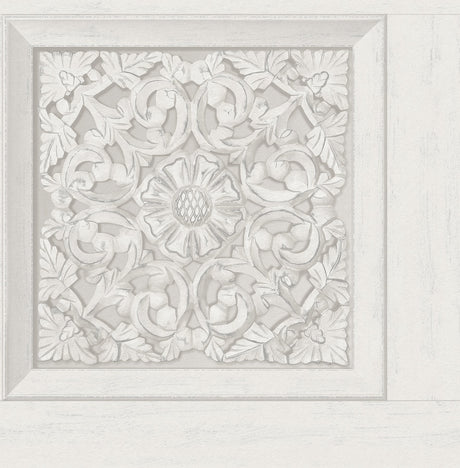 Carved Floral White Peel & Stick Wallpaper with Wood Panel Motif - InHome NHS6175
