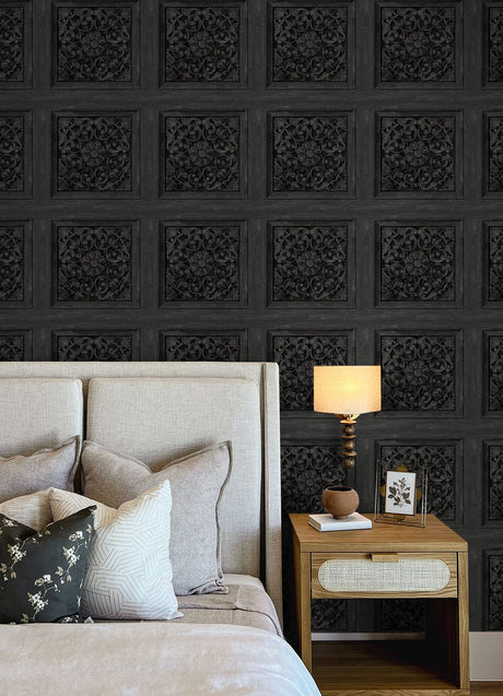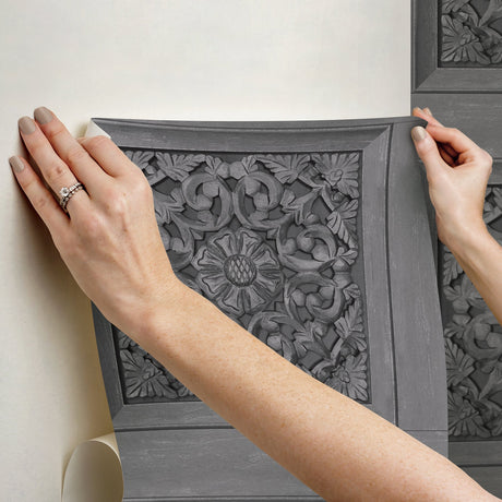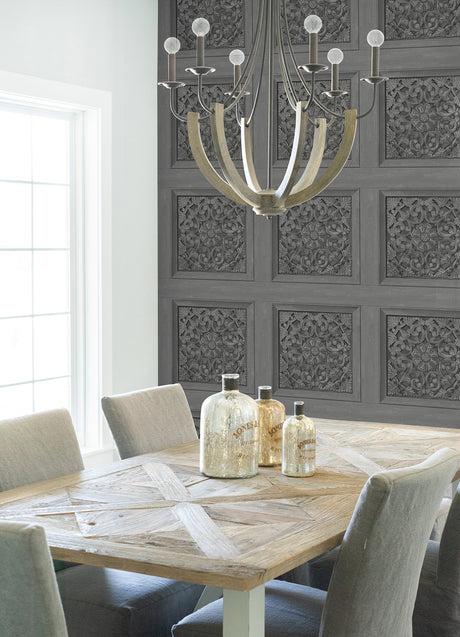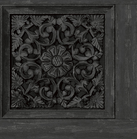 Carved Floral Grey Peel & Stick Wallpaper with Wood Panel Motif - InHome NHS6176