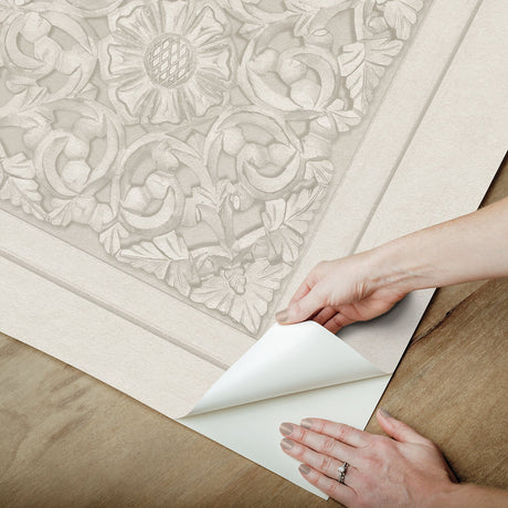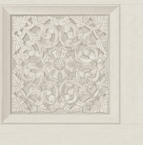 Carved Floral Cream Peel & Stick Wallpaper with Wood Panel Motif - InHome NHS6177