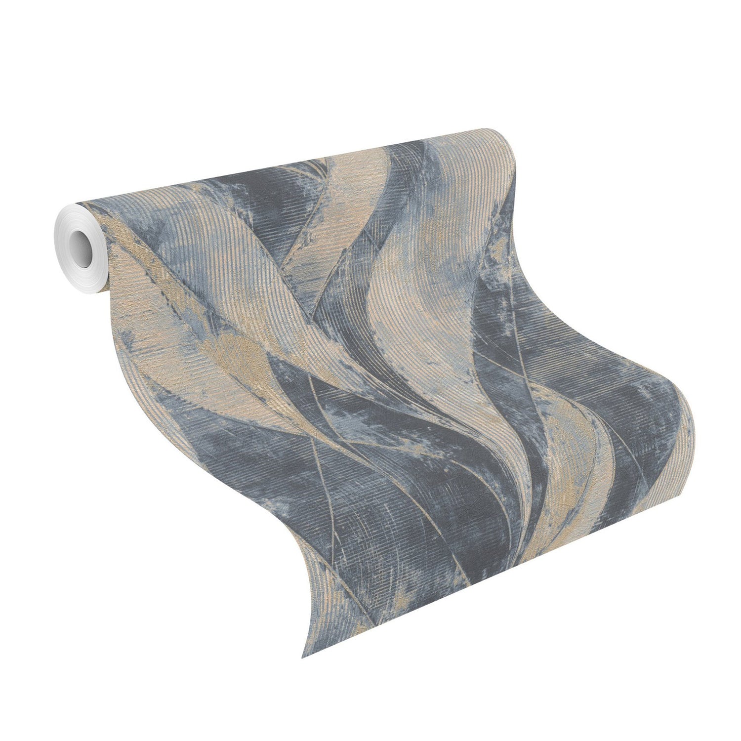 Enjoy a stately botanical accent with modern flair with this wallpaper. Blue columns of waving, abstract leaves are etched with textured lines and lightly brushed with gold. Blake is an unpasted, non woven wallpaper.