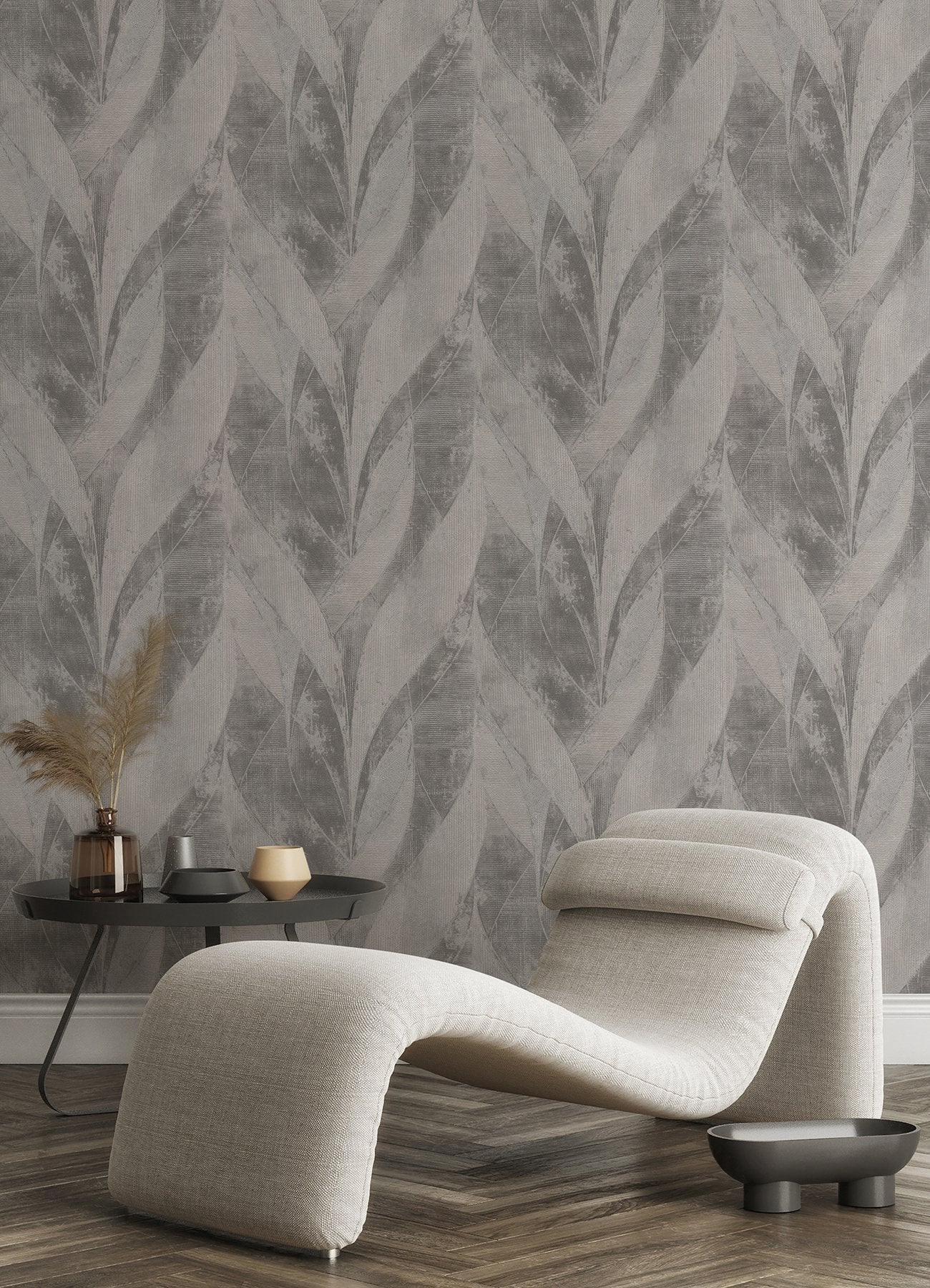 Industrial chic meets timeless elegance with this botanical wallpaper. The waving columns of abstract leaves are inked shades of white and grey, the sections given depth with textural, lined detailing and touches of silver. Blake is an unpasted, non woven wallpaper.