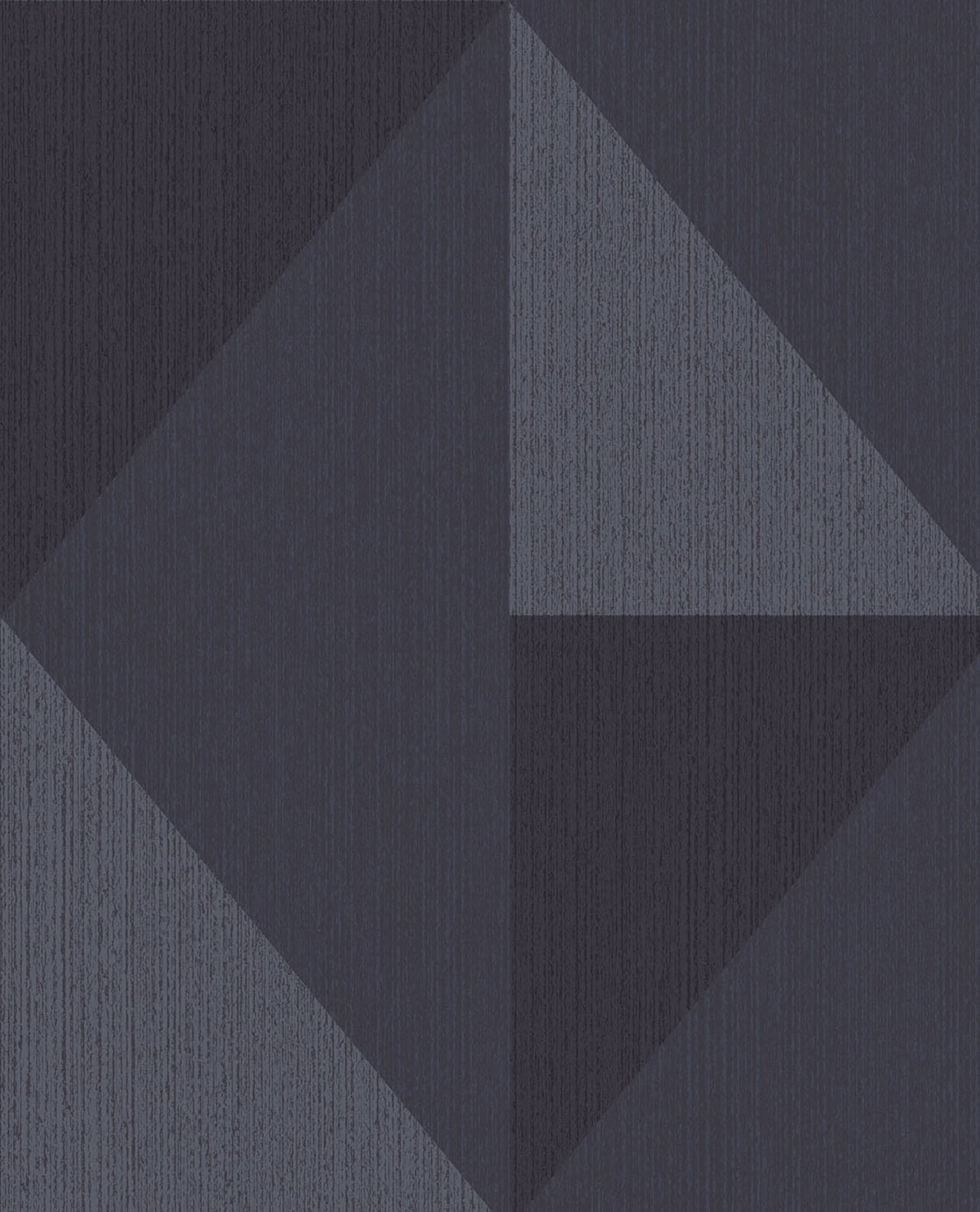 Sleek and sophisticated, three right isosceles triangles in shades of blue converge to form a diamond, the mid-tone blue sporting a metallic sheen. Raised inks similar to woodgrain spread across the design, providing the piece with texture. Diamond is an unpasted, non woven wallpaper.