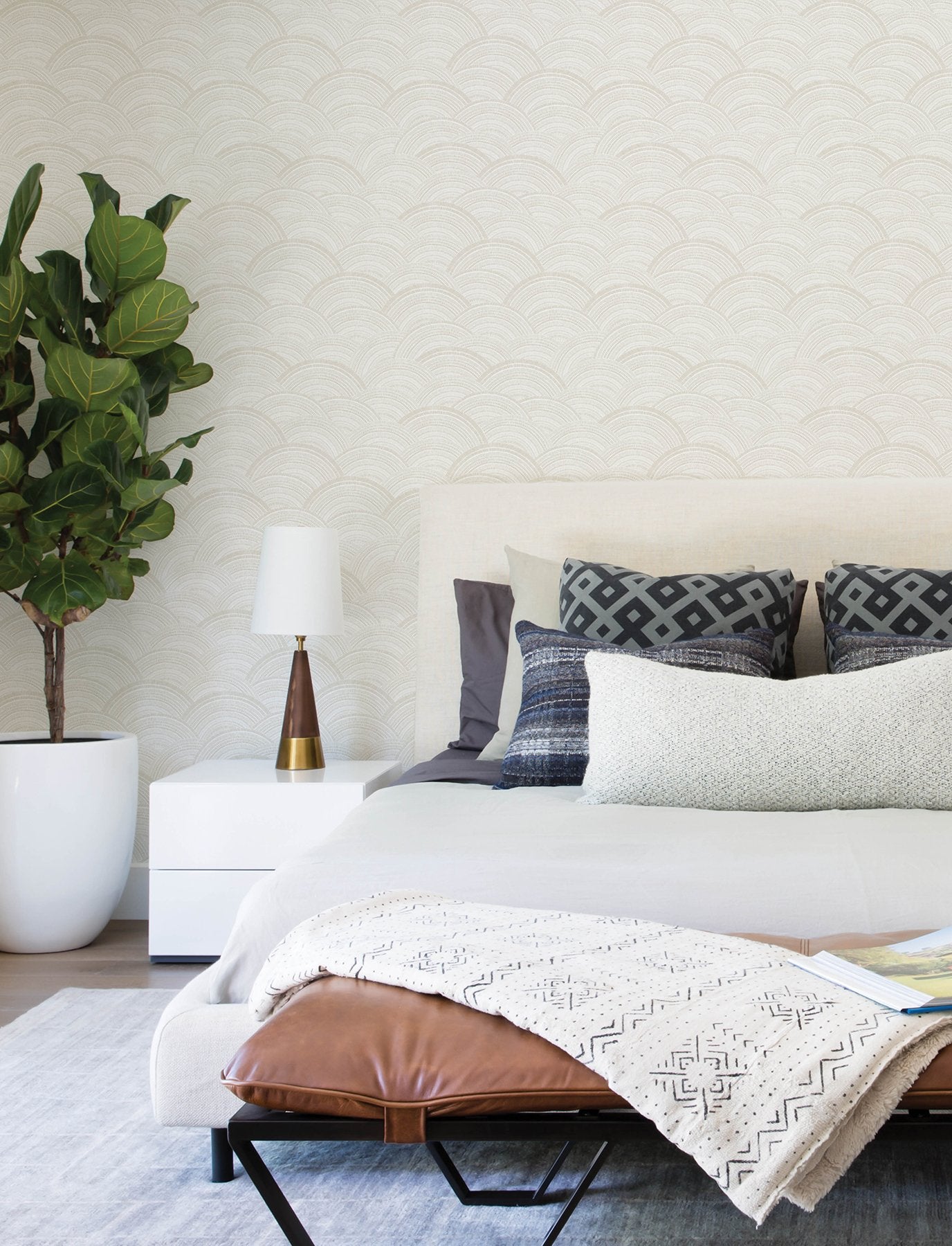 This artistic and whimsical wallpaper brings a dose of colorful cheer to interiors! Each overlapping arch is formed from dozens of pale taupe dashes against a warm white backdrop. Encircle is an unpasted, non woven wallpaper measuring 20.5 inches wide by 33 feet long, covering approximately 56.4 square feet per roll.