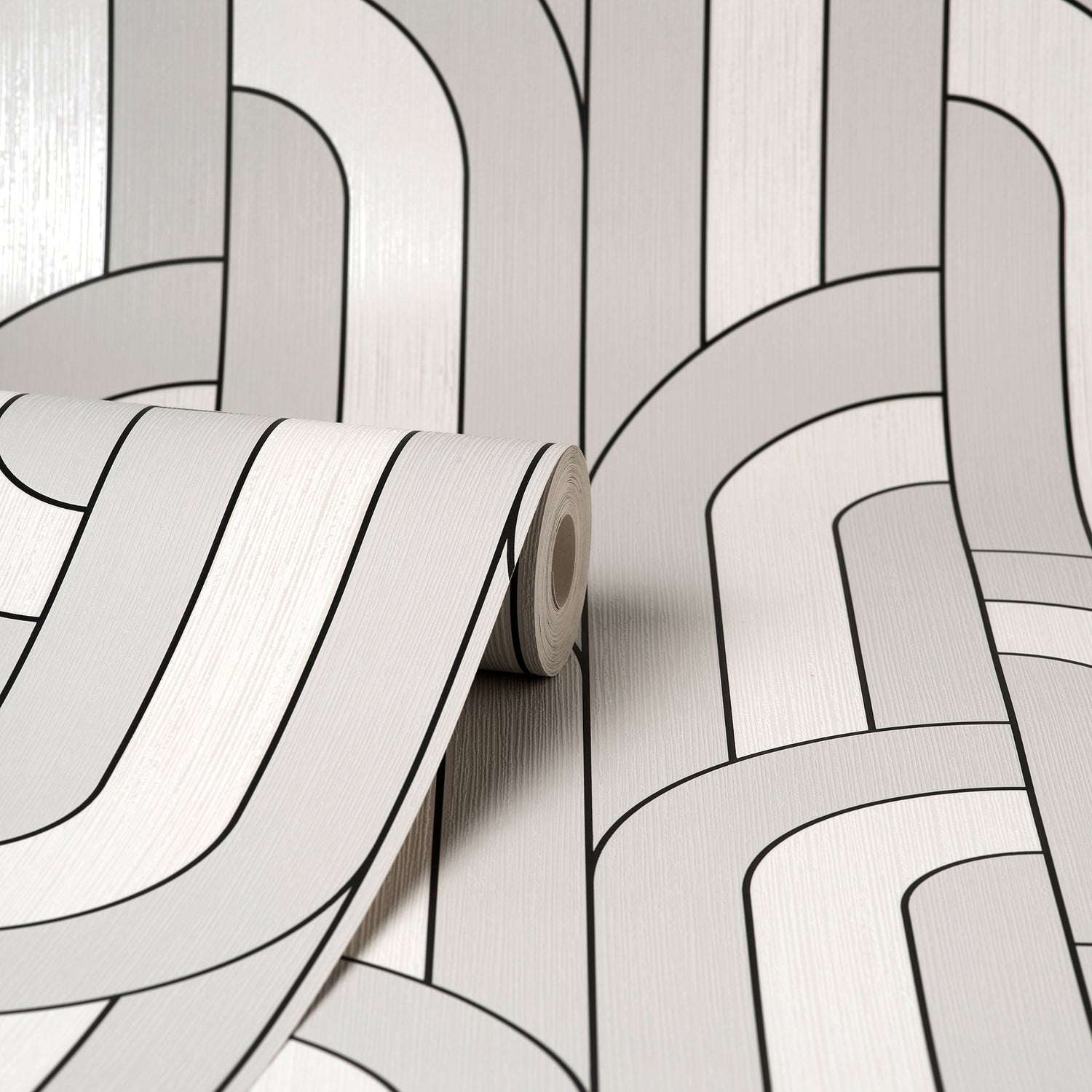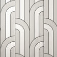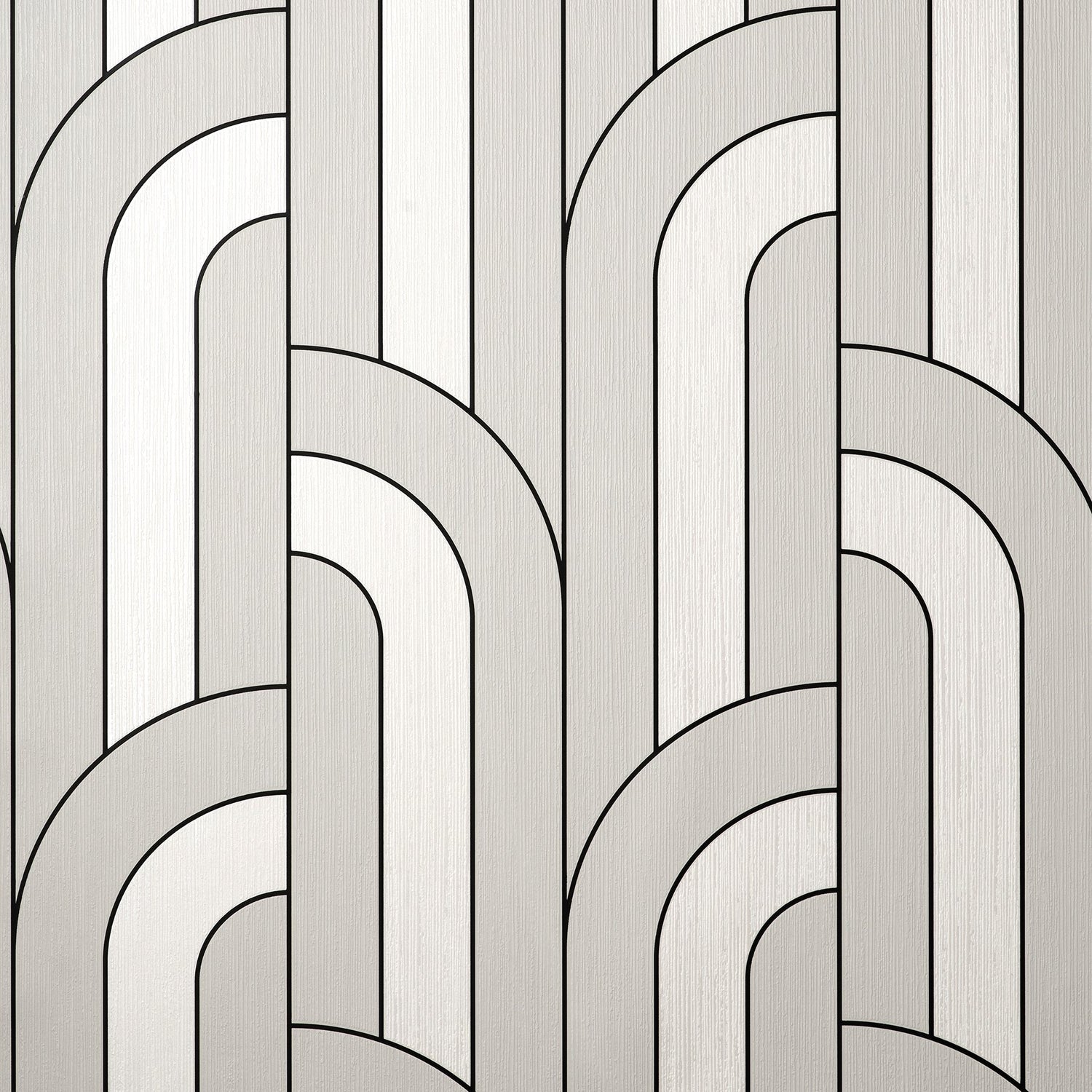 This arched, Art Deco-inspired wallpaper is a perfect blend of retro and modern. The staggered columns of arches alternate between shades of silver and grey, with prominent black outlines adding to its graphic look. Ezra is an unpasted, expanded vinyl wallpaper.