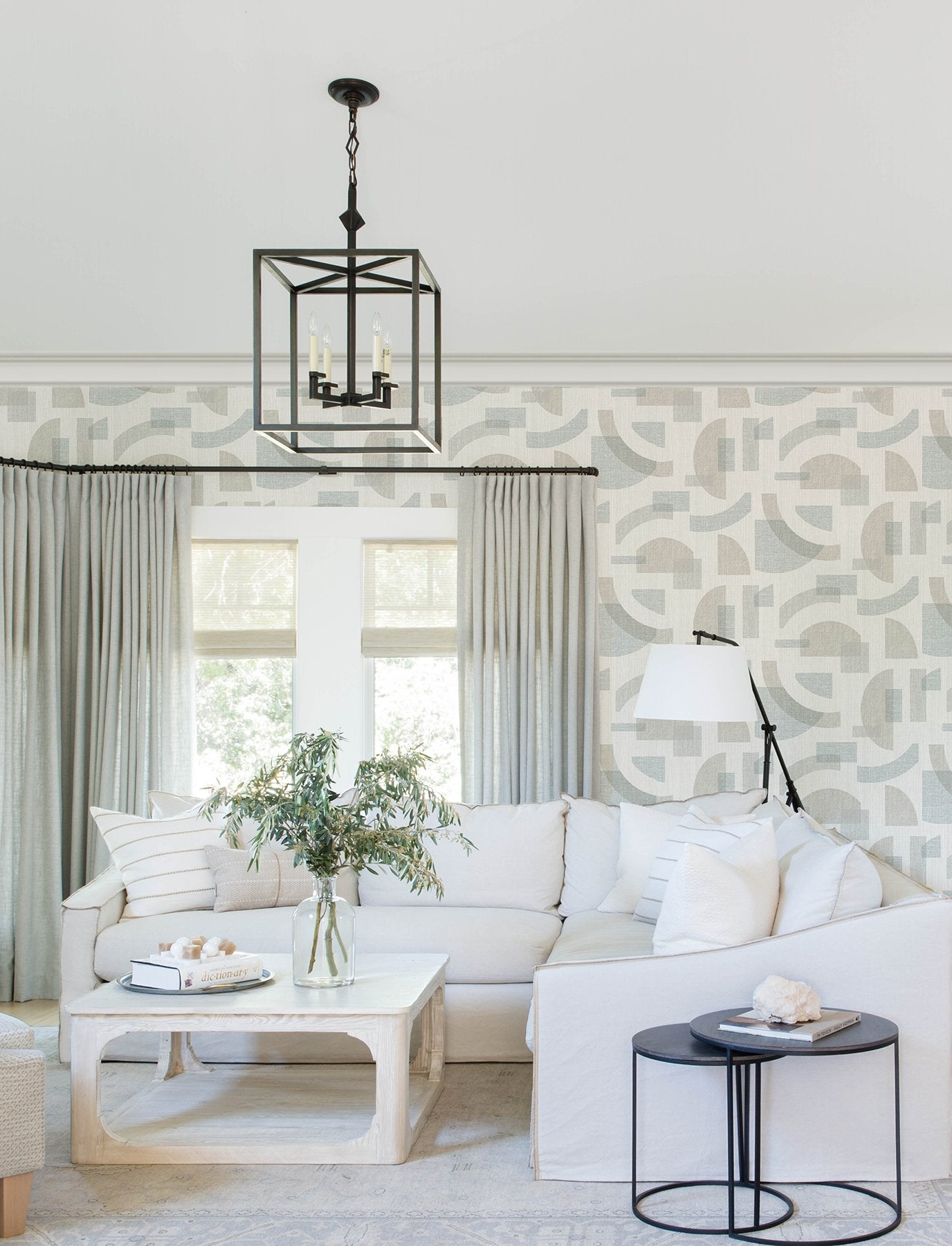 This geometric wallpaper brings playful elegance to interiors. The array of semicircles, rectangles, and other blocks are inked in light blue and pale greys against a white faux grasscloth base finished with a silver pearlescence. Fulton is an unpasted, non woven wallpaper measuring 20.5 inches wide by 33 feet long, covering approximately 56.4 square feet per roll.