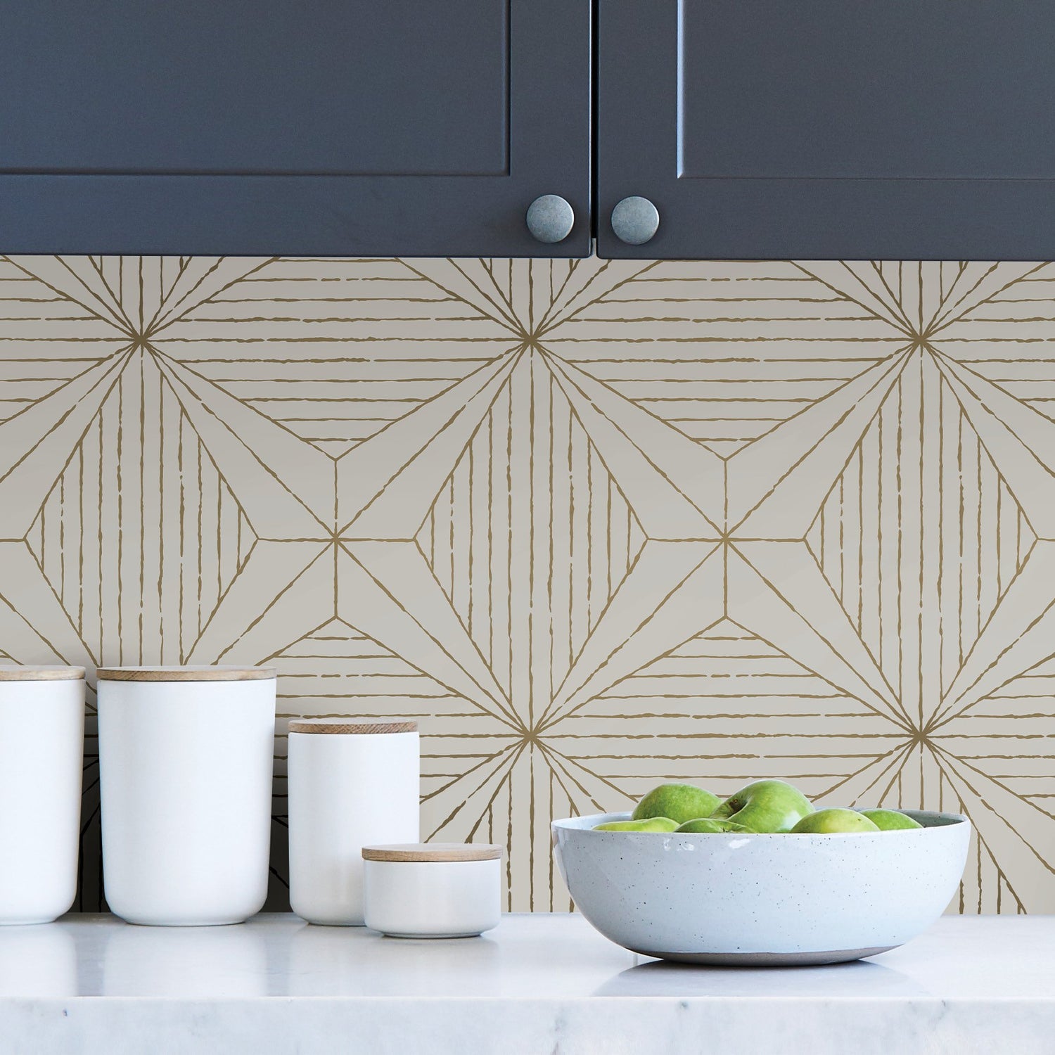 - A grey and gold geometric design from the Scott Living Self Adhesive Wallpaper collection