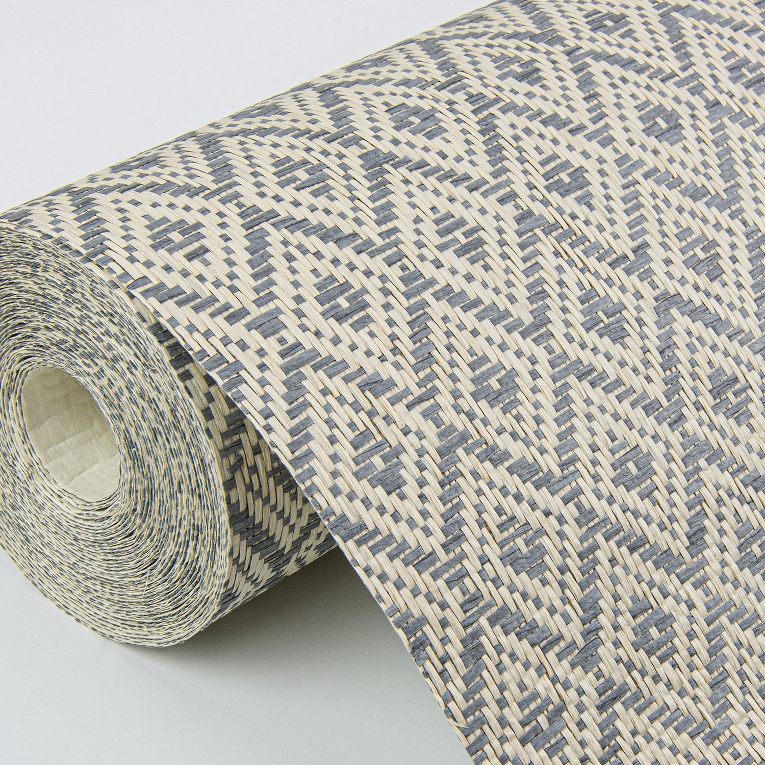 This modern grasscloth is an elegant balance of texture and pattern. The taupe and blue grasses are intricately woven together to create the continuous diamond design. Hui is an unpasted, paper weave grasscloth wallpaper.
