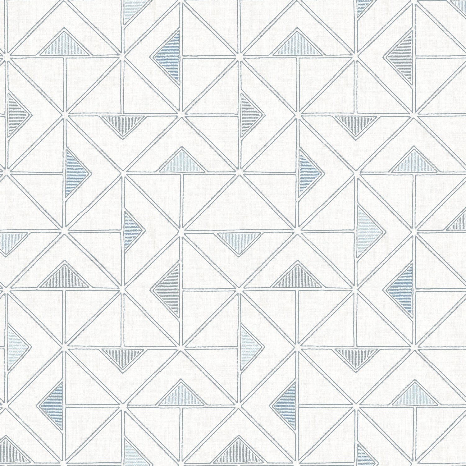 A delightful blend of retro and fresh, modern flair, this geometric wallpaper brings character and charm to your interiors. The hand-drawn triangular motif is accented with blue insets along a cool white faux linen backdrop. Jekyl is an unpasted, non woven wallpaper.