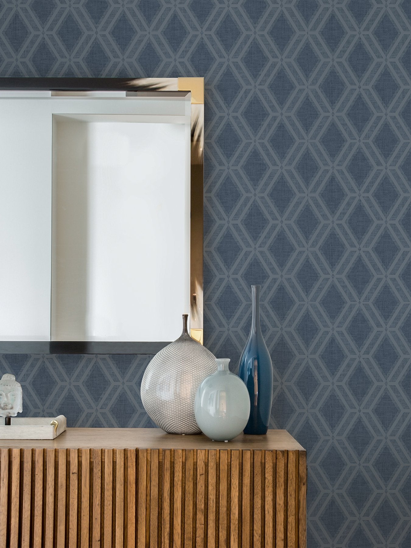 Give your home a sophisticated touch with this blue geometric wallpaper. Each diamond is infused with raised ink detailing that mimics the look and feel of linen. Mersenne is an unpasted, vinyl on paper wallpaper.