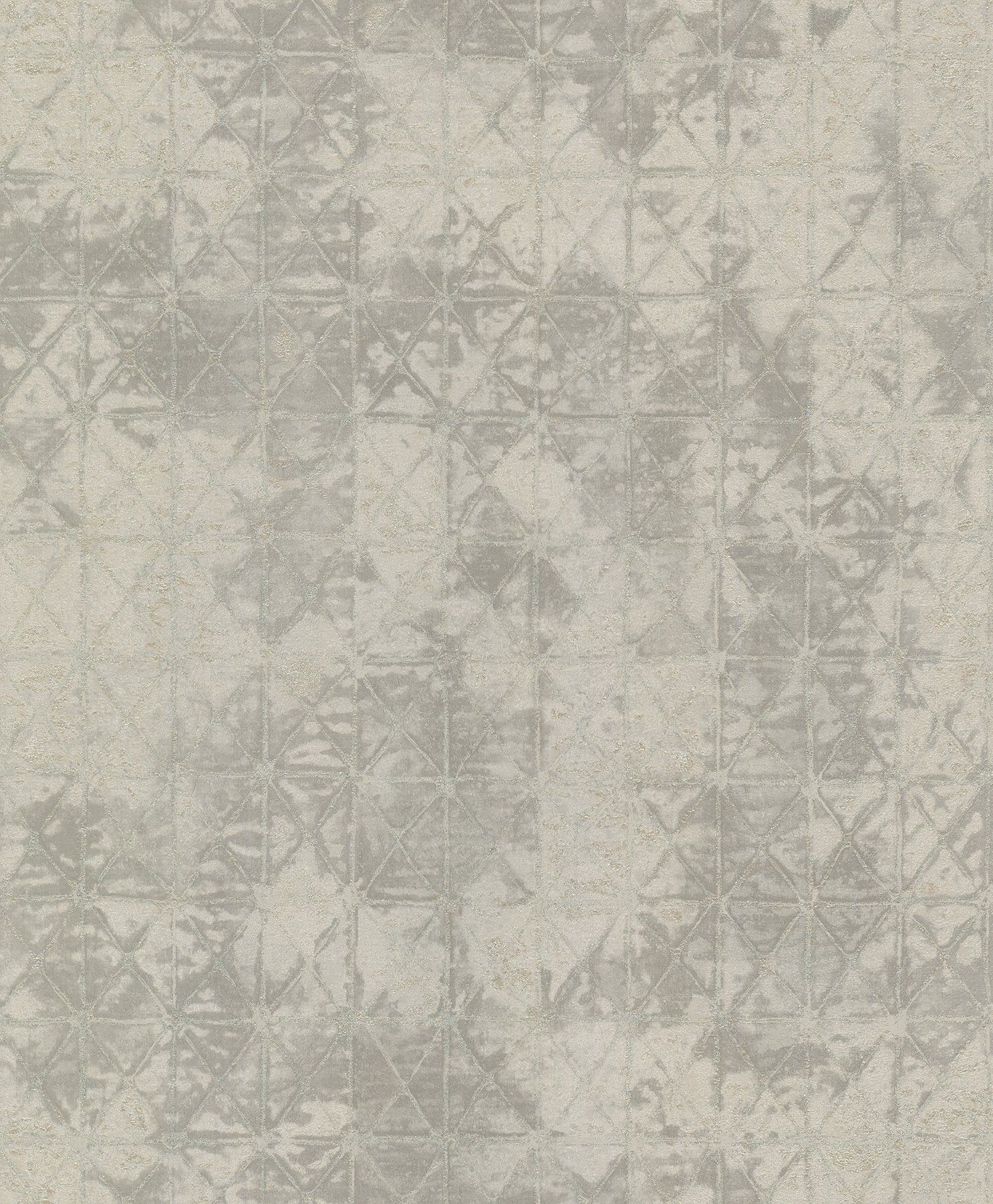 This wallpaper effortlessly combines Old World charm with modern convenience. The triangular tiles sport a mottled blend of grey accented with raised ink detailing lightly dusted in silver. Odell is an unpasted, non woven fabric backed vinyl wallpaper.