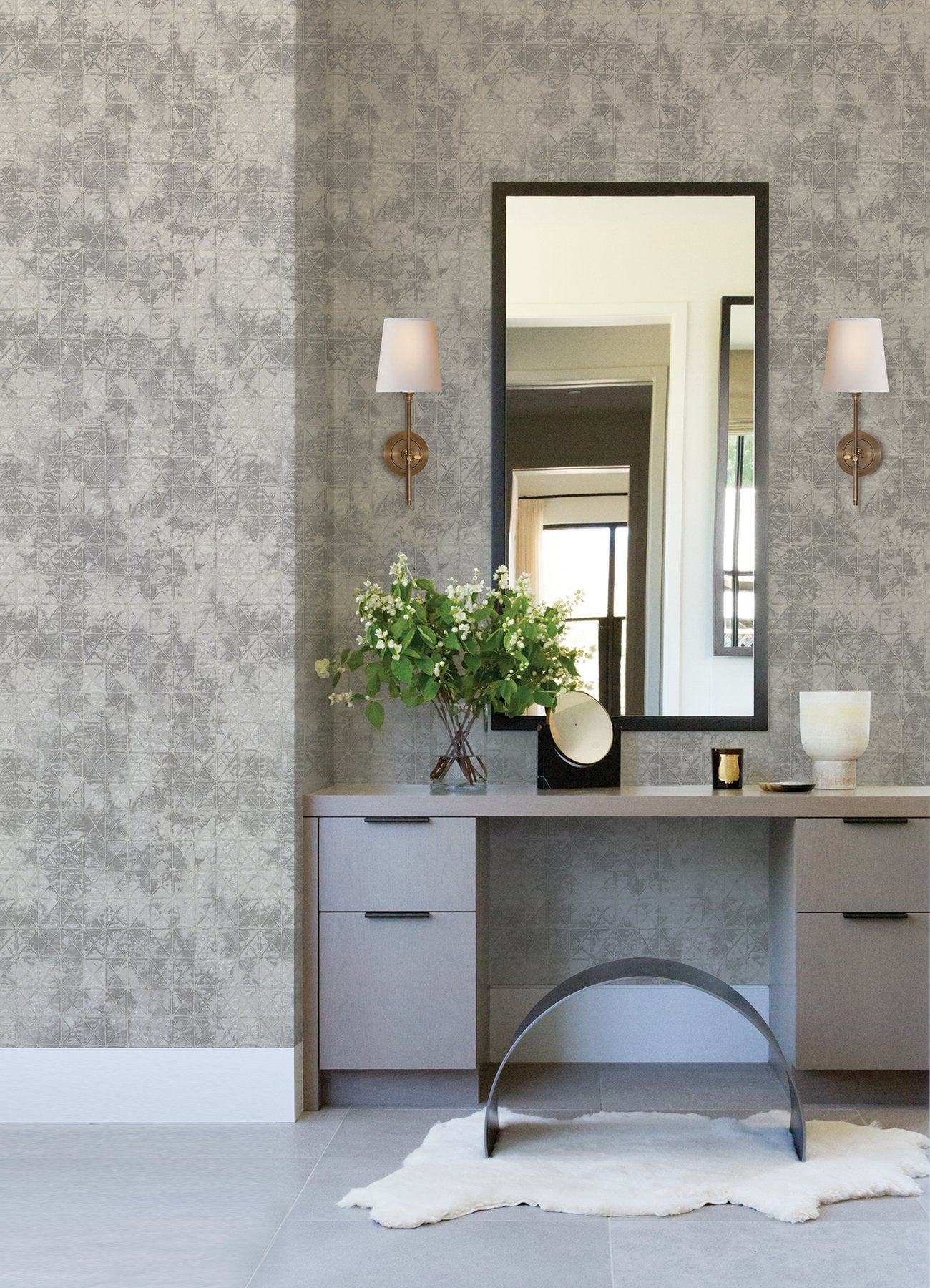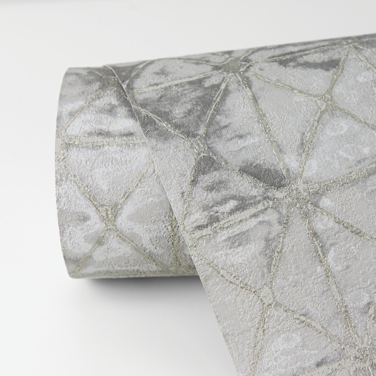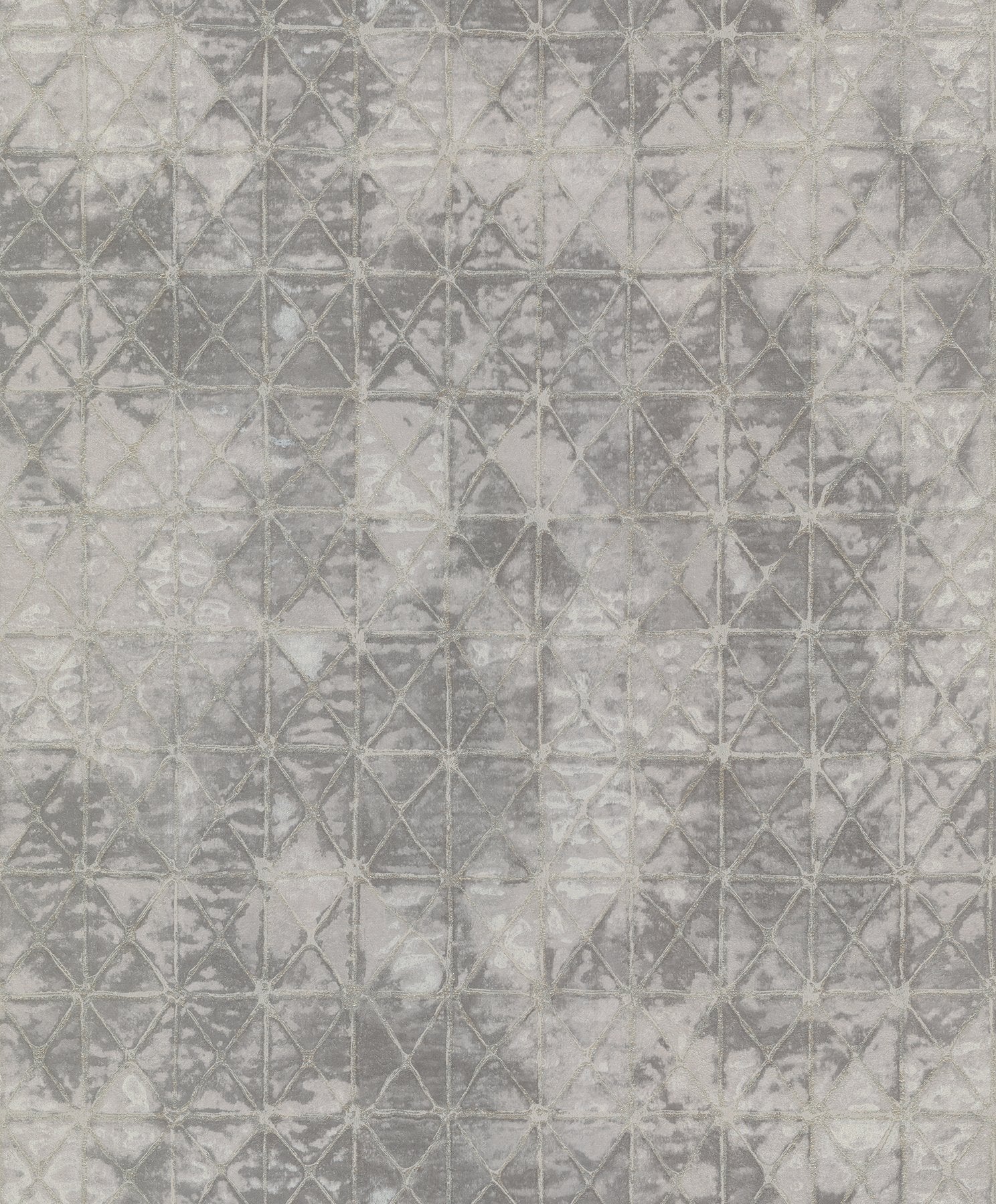 Enjoy the look of antique tile with this geometric wallpaper. The triangular segments are a range of mottled greys, with silverly grout lines finished with a subtle, silken sheen. Odell is an unpasted, non woven fabric backed vinyl wallpaper.