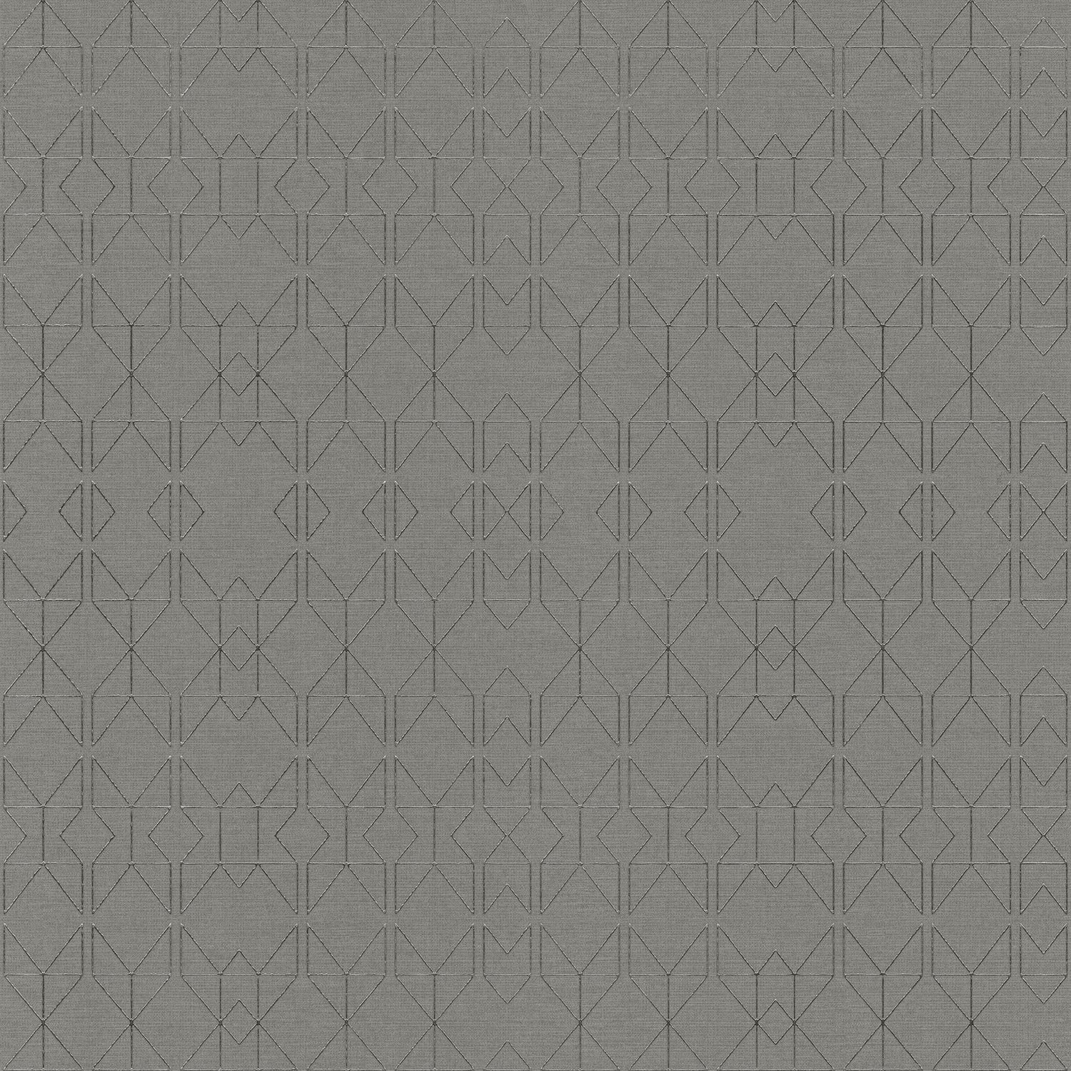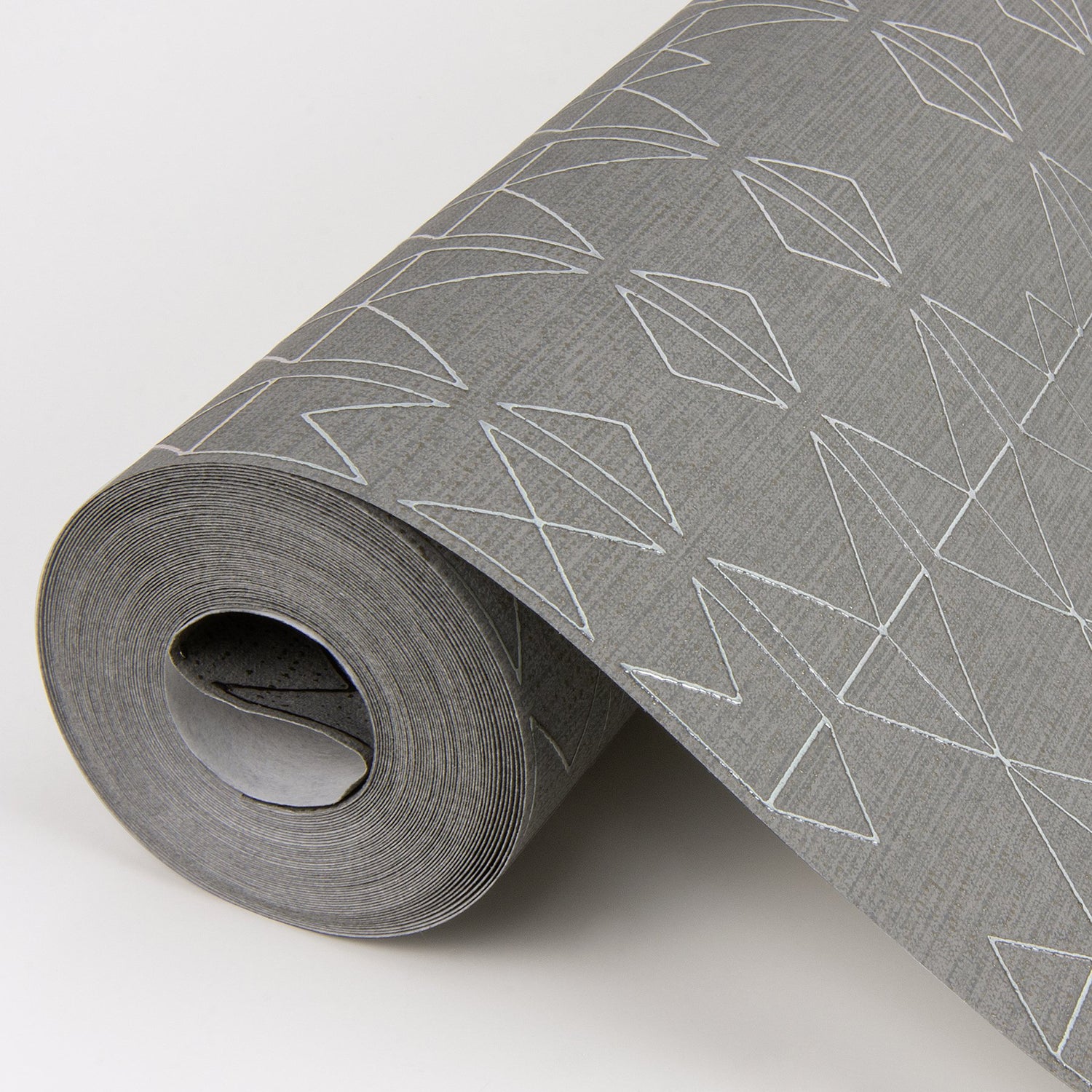 Sharp contrast and a holographic finish gives this geometric wallpaper dramatic appeal. The grey faux linen backdrop is overlaid with a delicate, shining silver diamond web. Paititi is an unpasted, foil on non woven wallpaper.