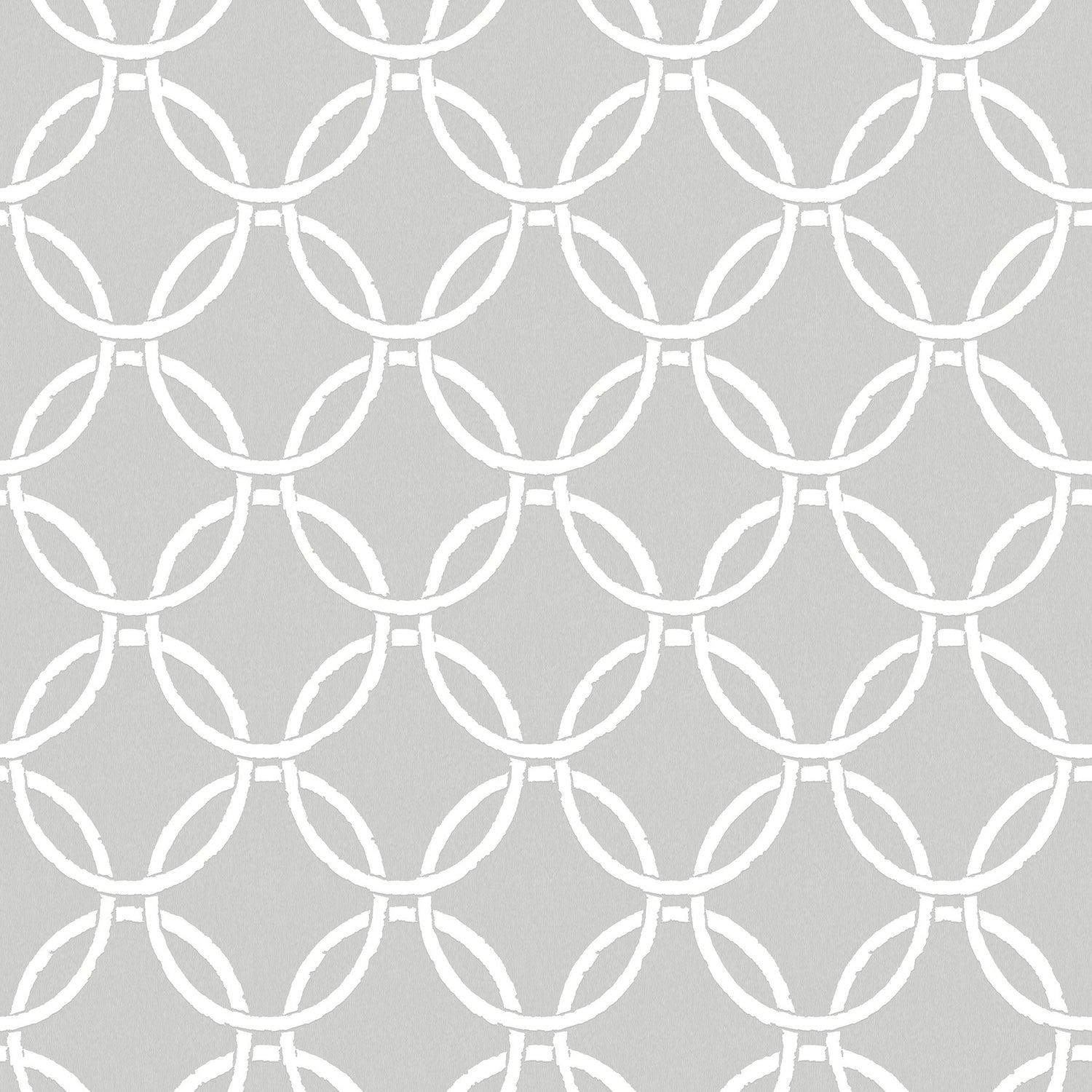 Traditional elegance meets modern simplicity with this geometric wallpaper. The cool grey backdrop is overlaid with an interlocking chain of large, white circles. Quelala is a prepasted, acrylic coated paper wallpaper.