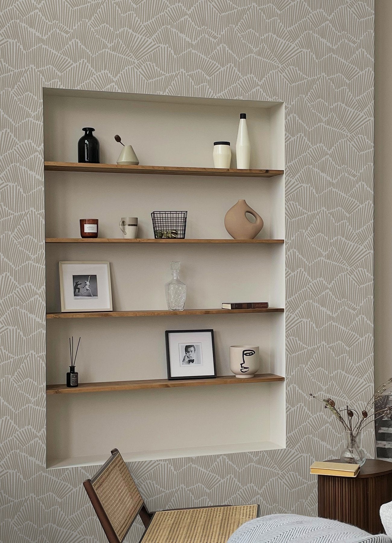 - Beige peel and stick NuWallpaper designed by Egypt Sherrod.