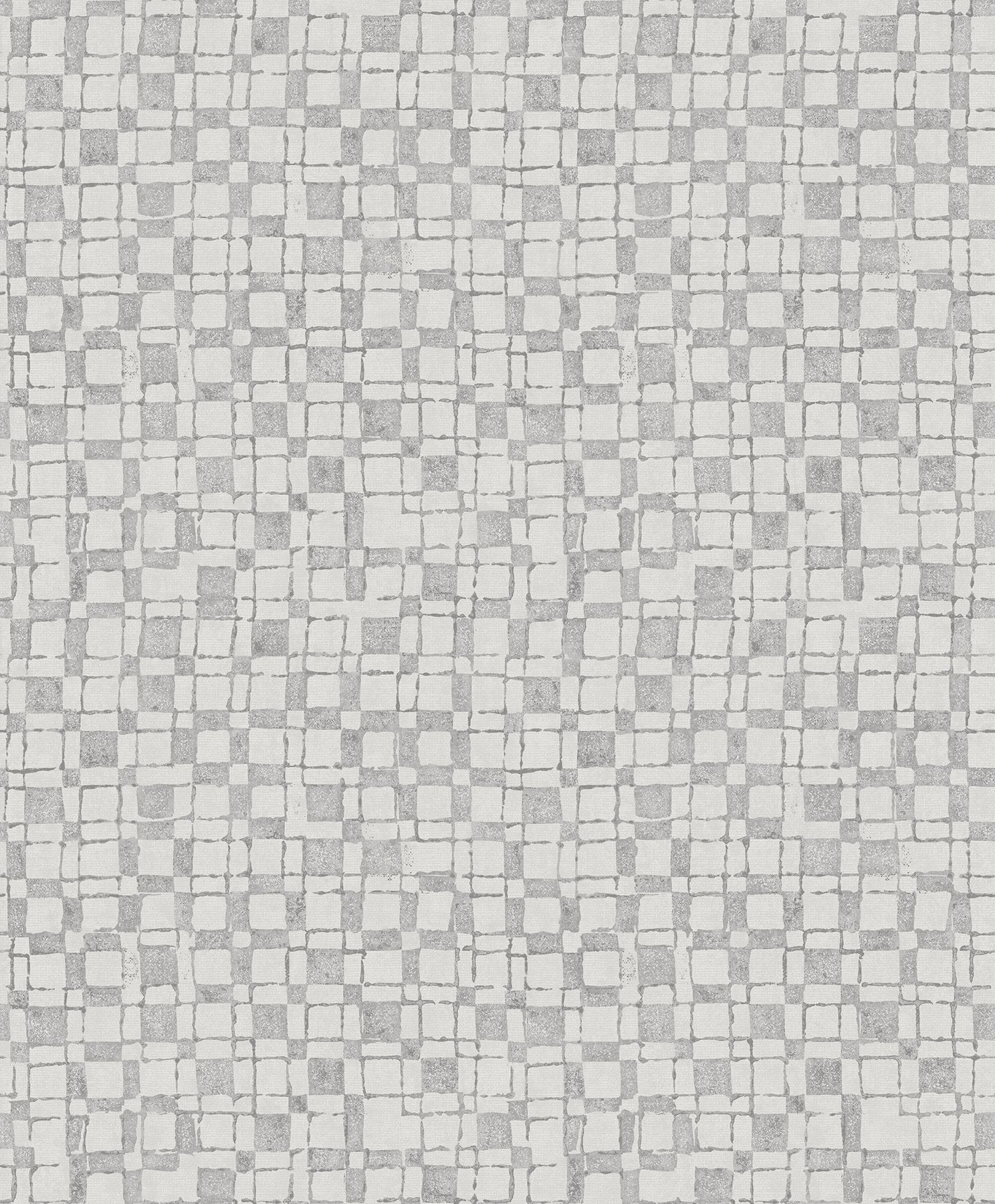 This simple geometric pattern will add serious visual interest to your walls. A light grey backdrop is covered by a grey checkerboard grid that's accented with metallic silver raised inks. Sarni is an unpasted, foil on non woven wallpaper.
