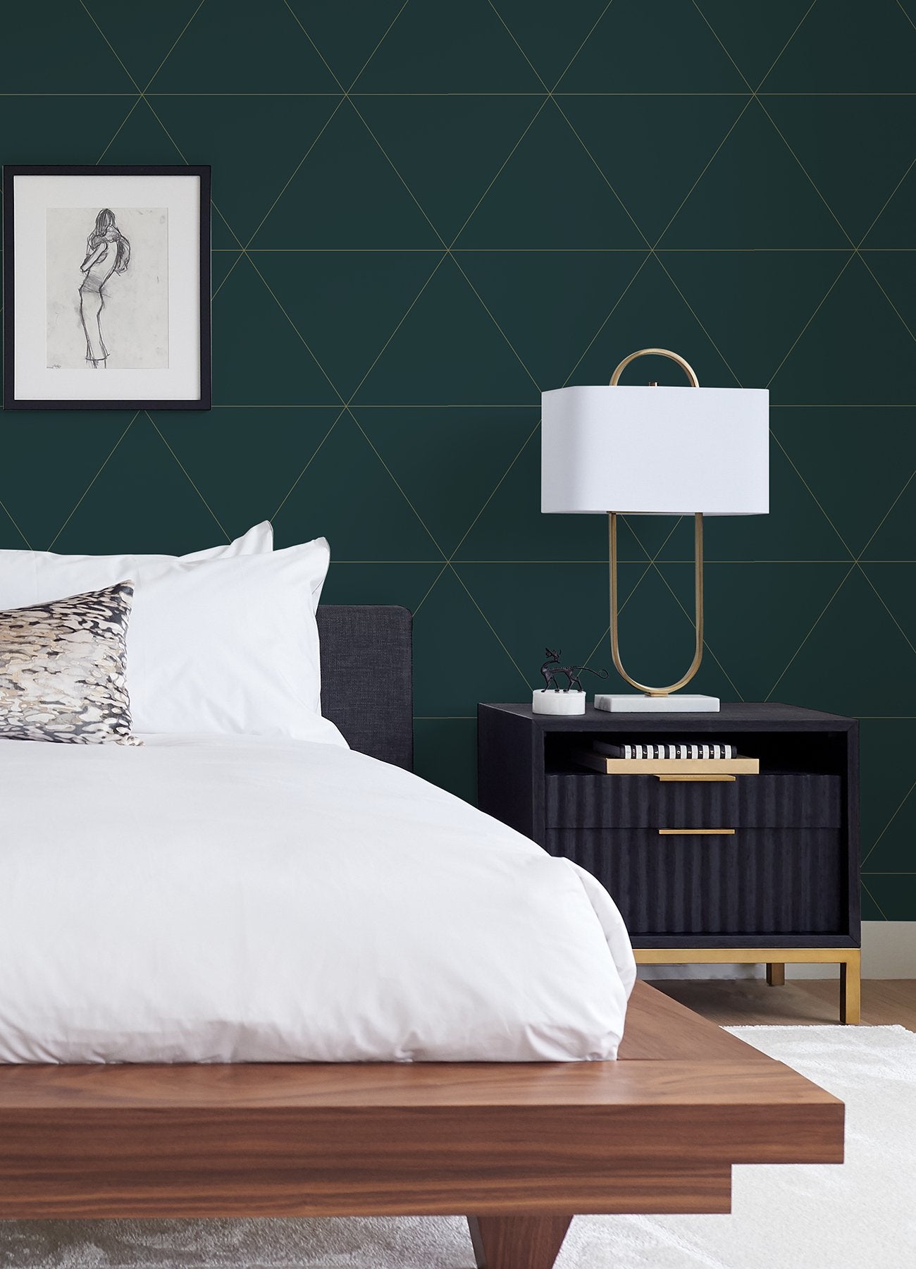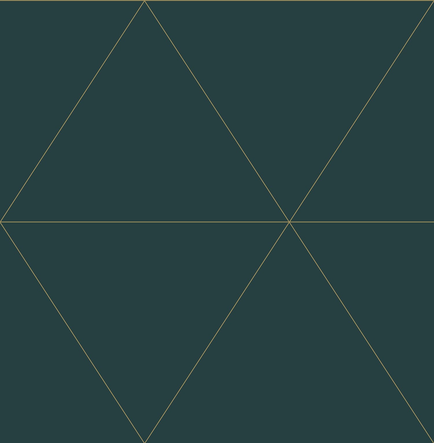 Infuse your space with rich color and subtle detailing. This deep indigo-teal is detailed with thin, golden lines that separates the color into large triangles. Twilight is an unpasted, acrylic coated wallpaper.