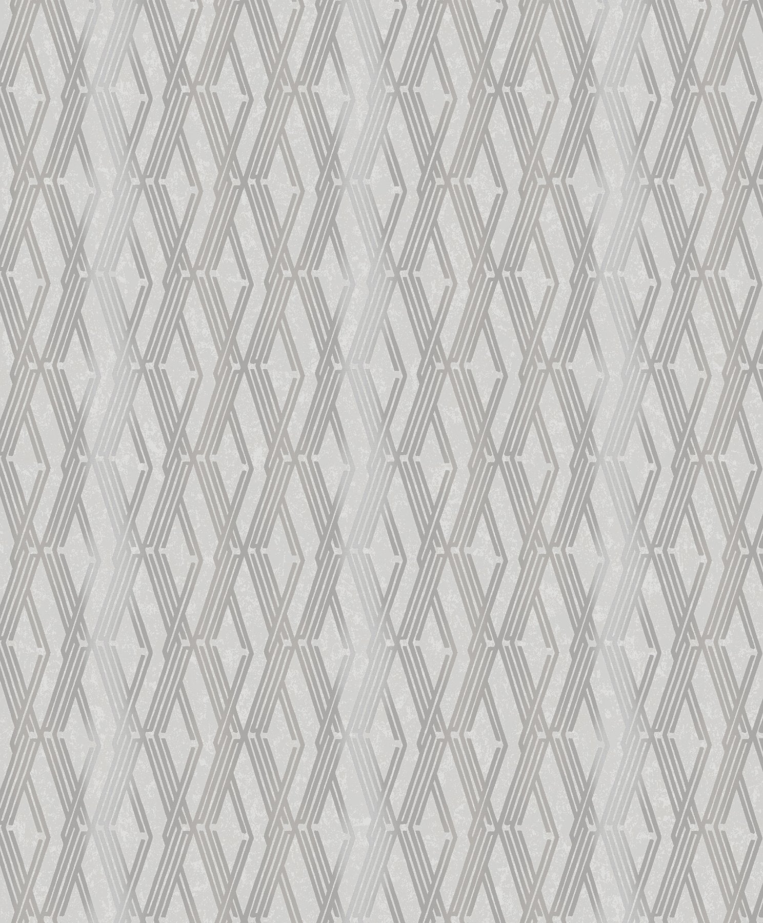 Enjoy elegant dimension with this elevated geometric design. Thin, dark grey ribbons imbued with a silver sheen form linked diamond chains along a distressed grey backdrop. Ushas is an unpasted, non woven wallpaper.