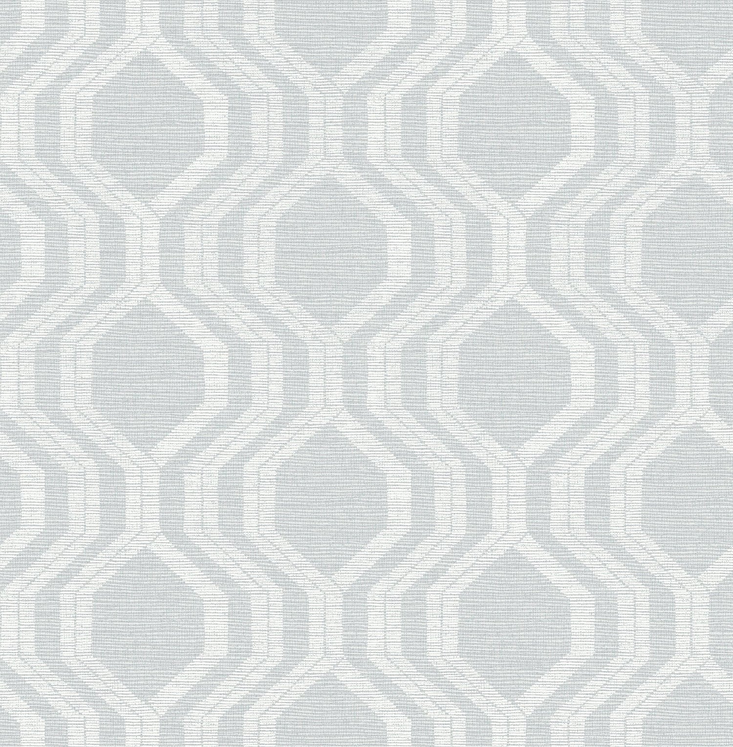 This modern update to classic ogee styling features hexagonal detailing, faux grasscloth texture, and two tones of steely grey finished with a metallic silver sheen. Burton is an unpasted, non woven wallpaper measuring 20.5 inches wide by 33 feet long, covering approximately 56.4 square feet per roll.