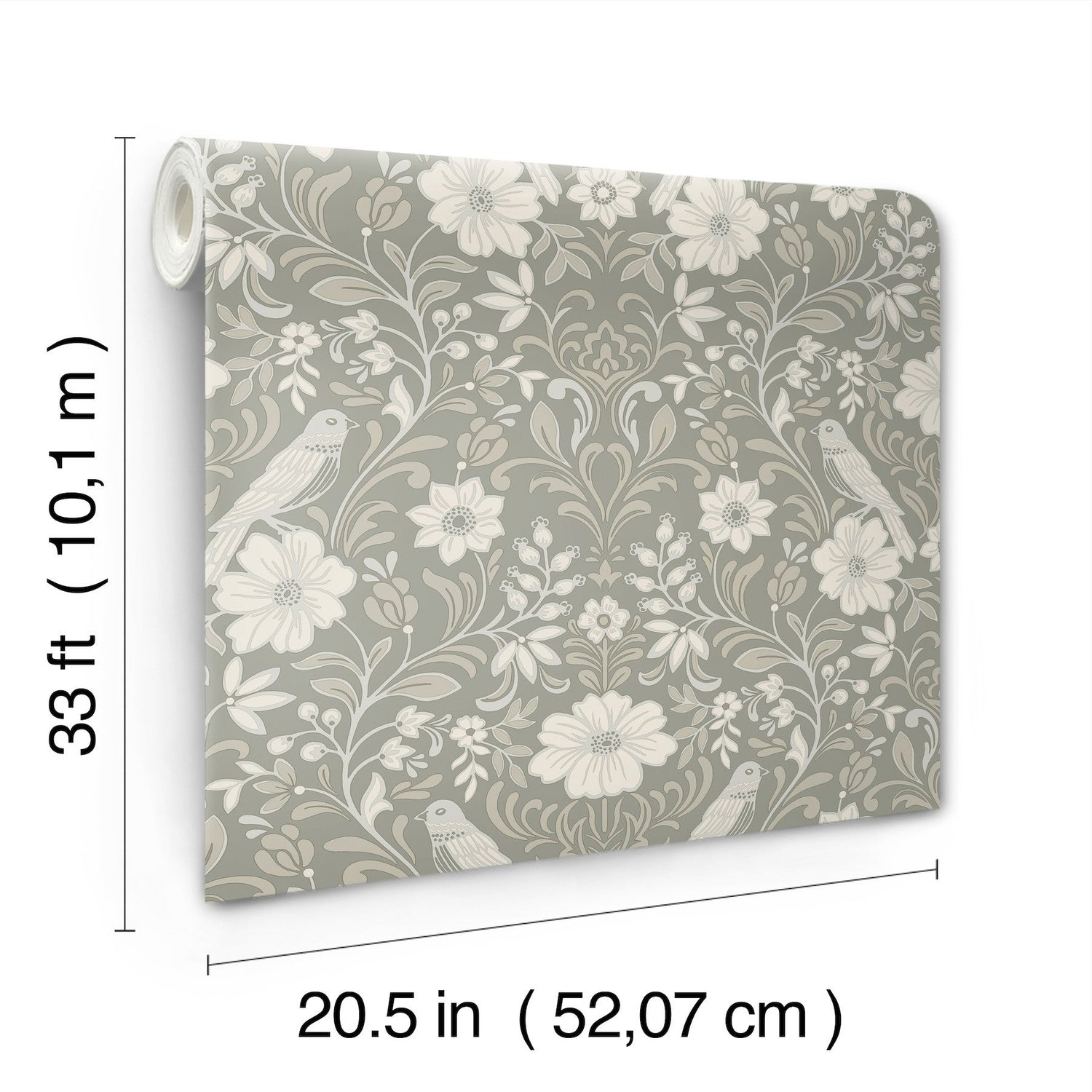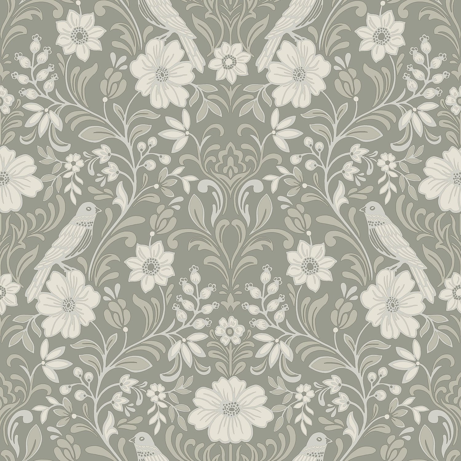 Sparrows perch on flourishing blooms amid rich vines and ripe berries in this delightful woodland damask wallpaper. Featuring white and neutral detailing against a grey backdrop. This Colette Wallpaper measures approximately 20.5 inches wide by 33 feet long, measuring approximately 56.4 square feet per roll. This collection of timeless wallcoverings is layered with warmth and charm, and effortlessly blends nostalgic patterns with modern designs. This assortment has a little bit of everything—simple stripes, subtle plaids, vintage motifs, and bold florals.