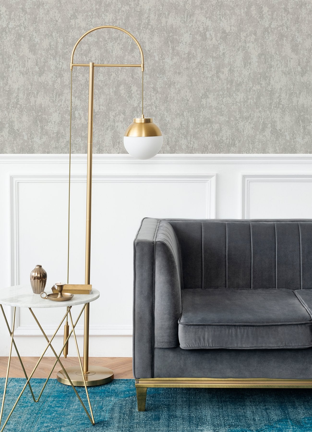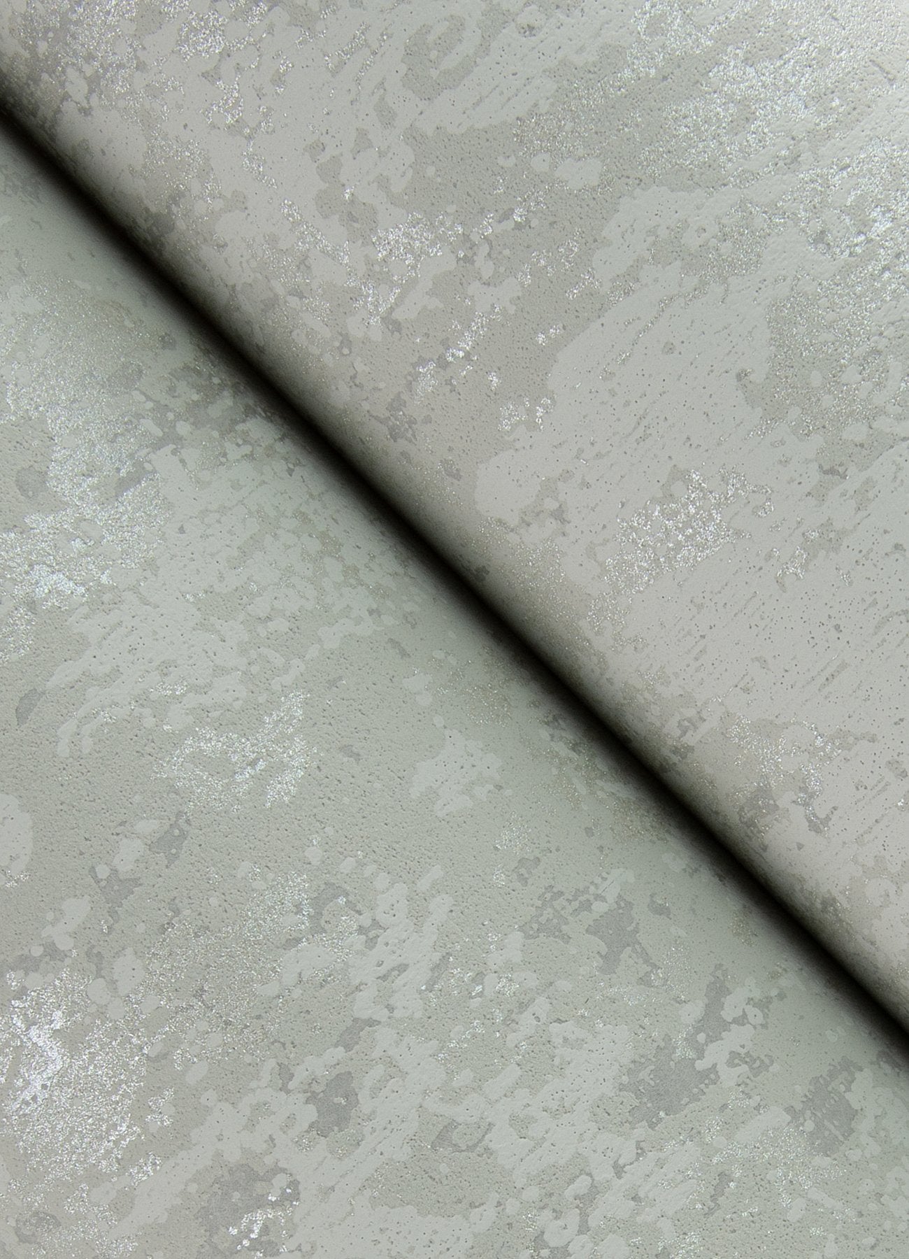 Elevate the timeless and textural appeals of plaster with a hint of shine! Several grey hues are layered together and finished with a final sponged layer of metallic silver. Haliya is an unpasted, non woven wallpaper.