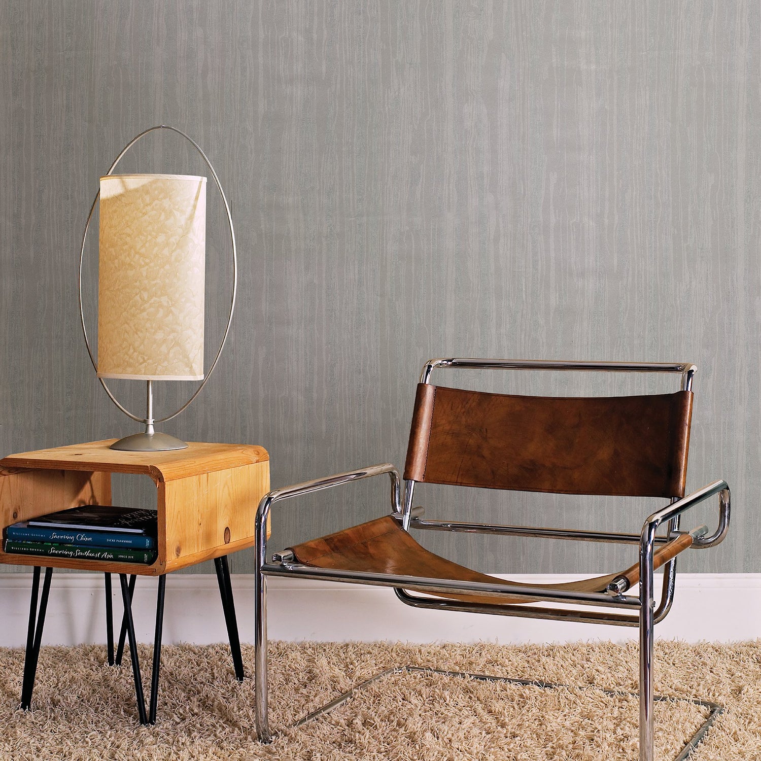 Rustic with a glamorous twist, this chic silver design is made to resemble wood. Its glitter accents among the wood grain pattern will dazzle on walls. Nova is an unpasted, non woven wallpaper.