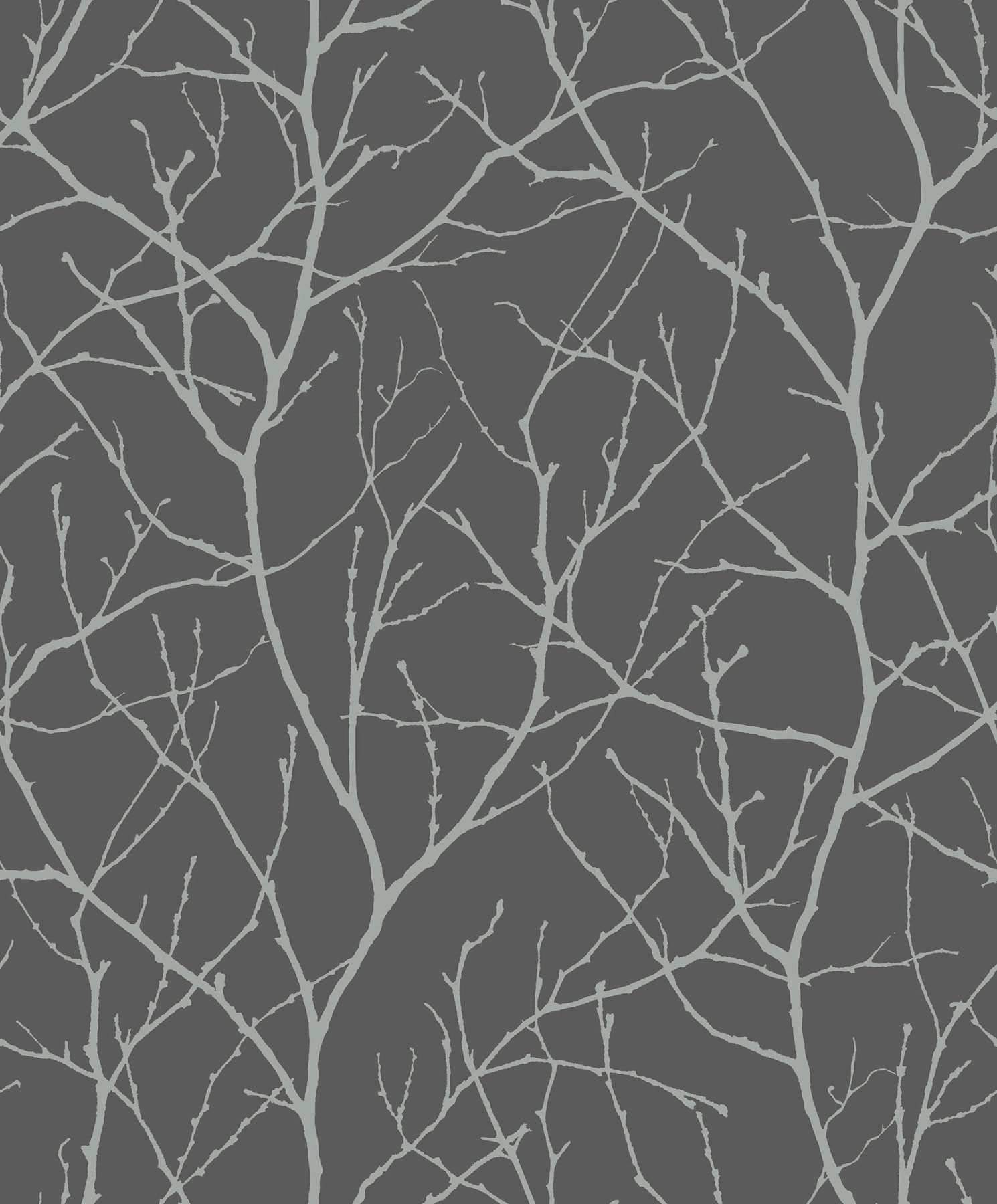 Trees Silhouette Charcoal & Silver Wallpaper with Metallic Botanical Branch Pattern - York MD7125
