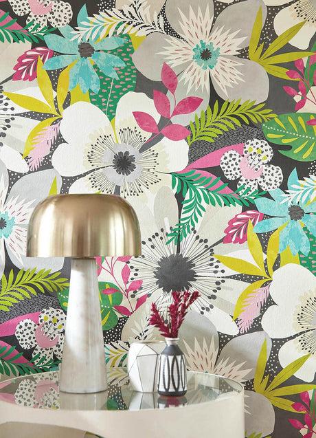 Janis Charcoal Floral Riot Wallpaper with Bohemian Botanical Pattern - ohpopsi CEP50101W