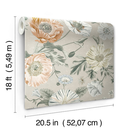 Vintage Poppy Orange Peel & Stick Wallpaper in Orange Floral on Linen Ground - York RMK12811PL