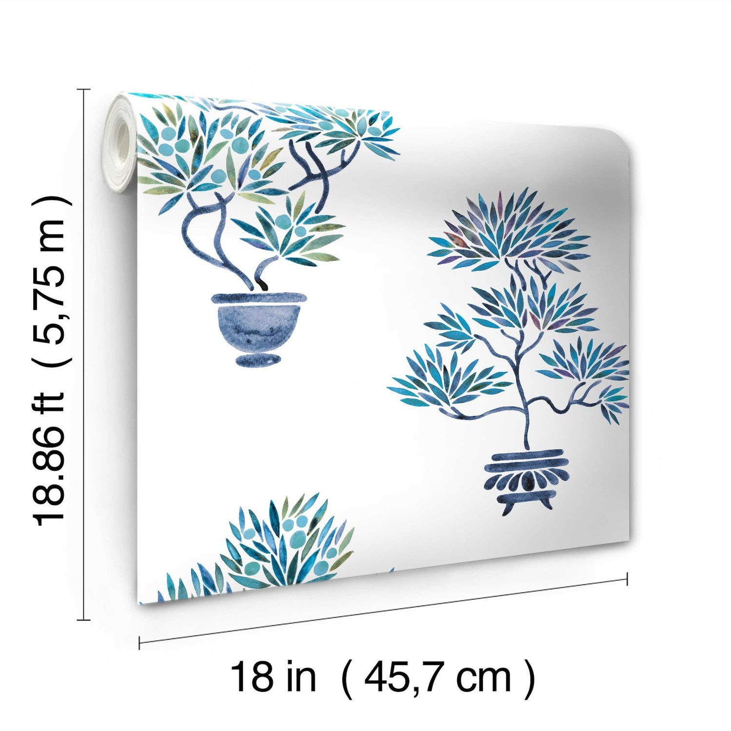 Cat Coquillette Bonsai Blue Peel & Stick Wallpaper with Botanical Bonsai Tree Motif - York RMK12648RL - Roll is backordered and will ship as soon as it is back in stock.