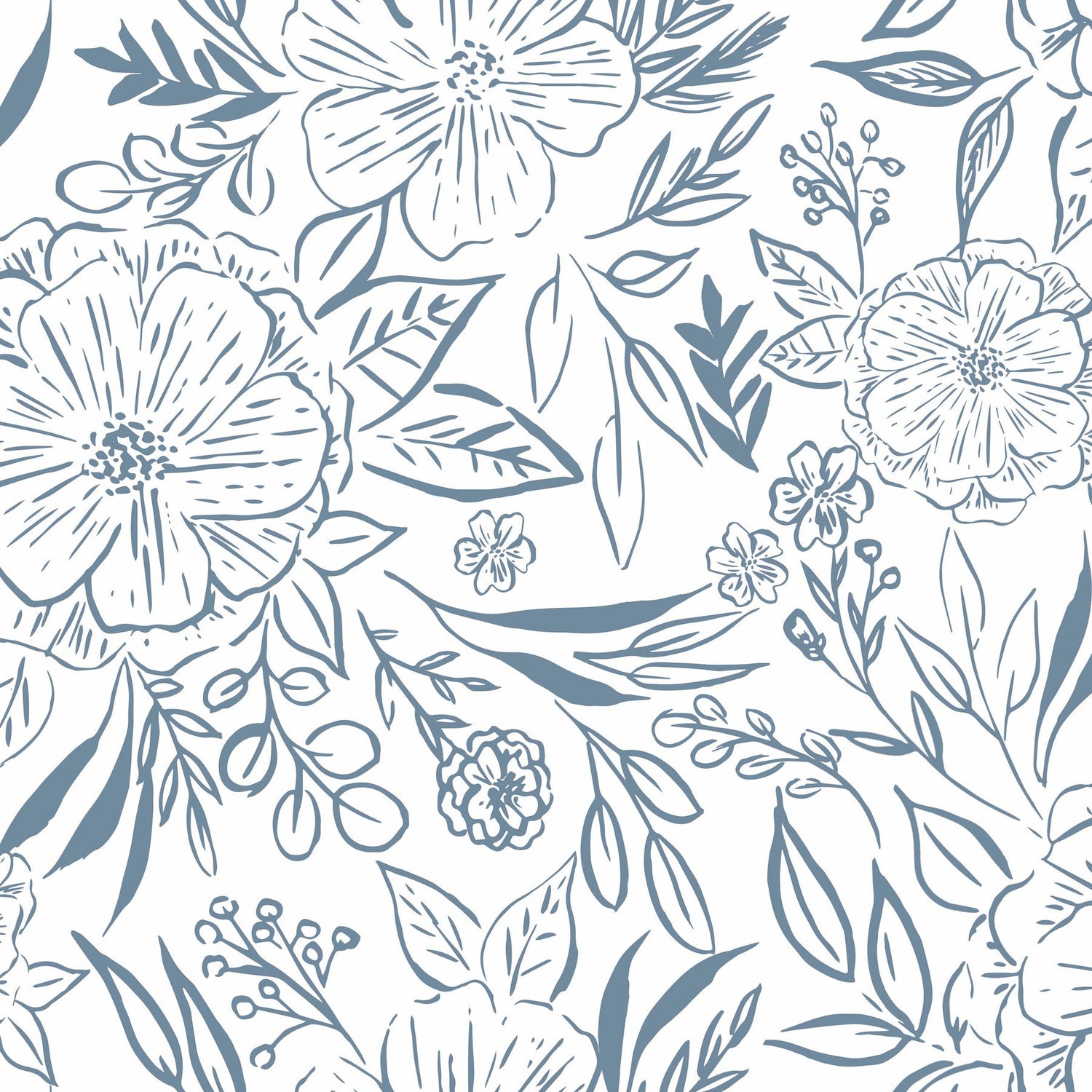 Floral Sketch Blue Peel & Stick Wallpaper with Botanical Floral Sketch Motif - York RMK12361PLW - Roll is backordered and will ship as soon as it is back in stock.