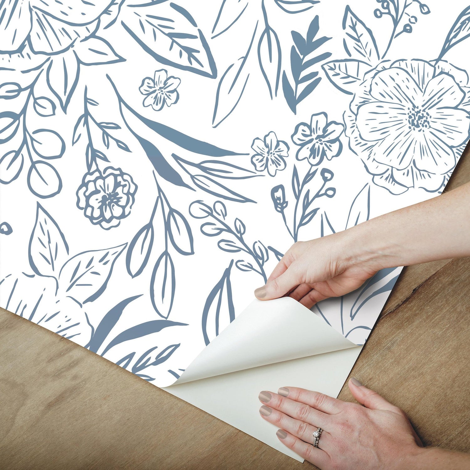 Floral Sketch Blue Peel & Stick Wallpaper with Botanical Floral Sketch Motif - York RMK12361PLW