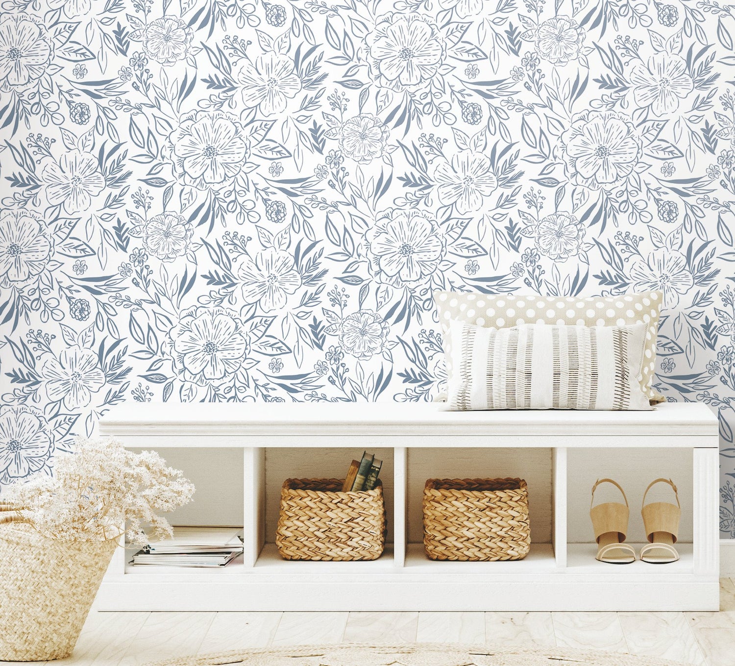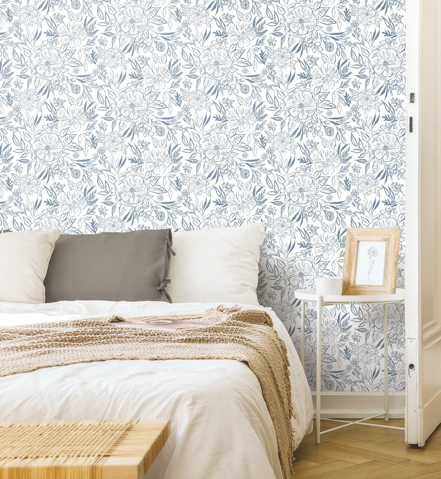 Beautifully blooming, this peel and stick wallpaper print will add an artsy charm to any space with ease. Blue sketches of floral motifs spread across a white backdrop. Installation is as simple as Peel, Stick, Done!™