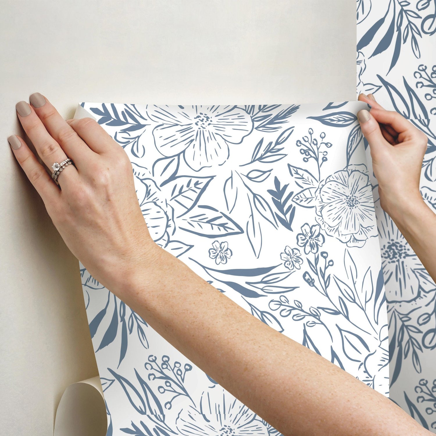 Detailed Name: RoomMates 216-in by 20.5-in Floral Sketch Blue Peel & Stick Wallpaper
