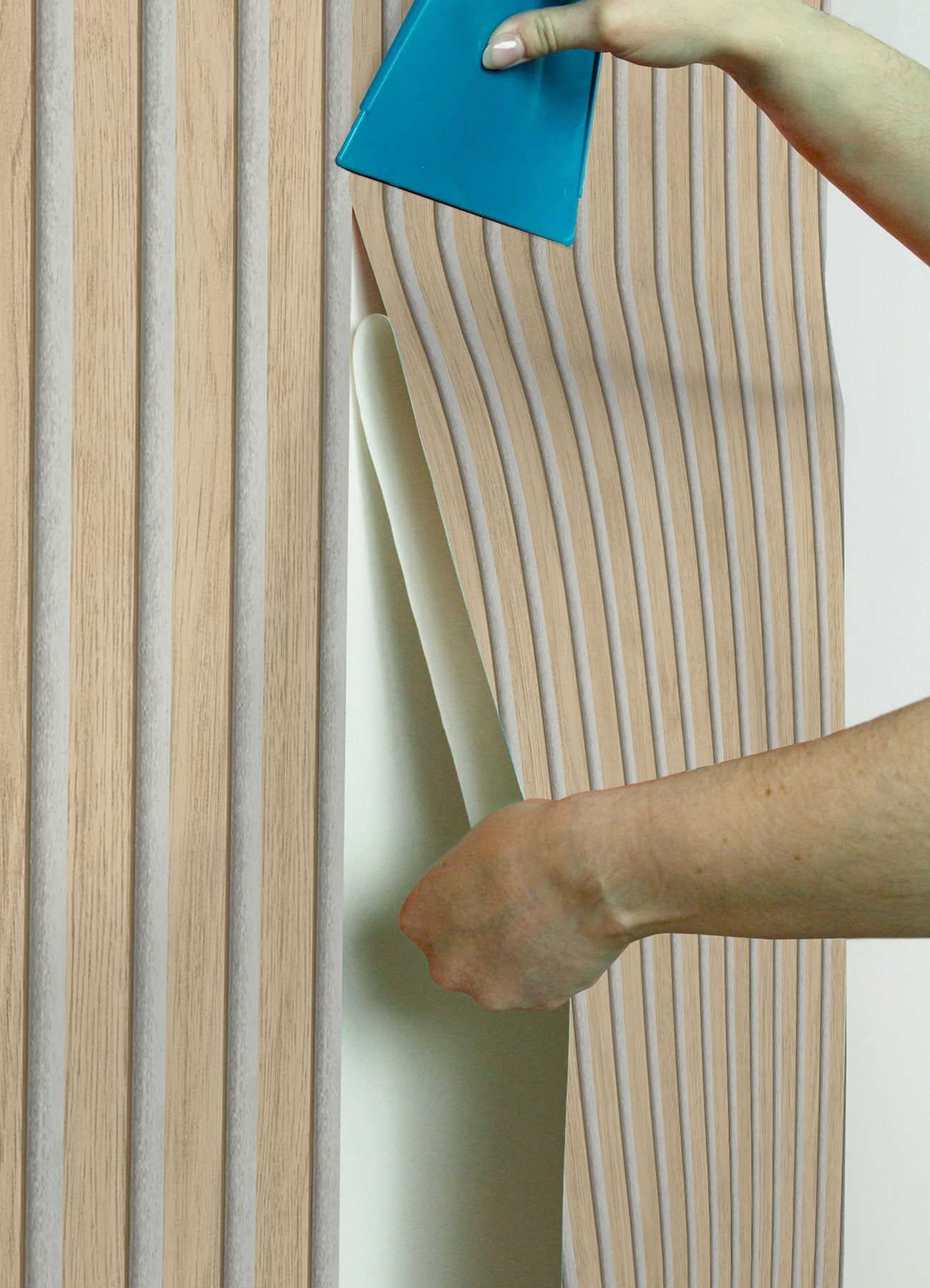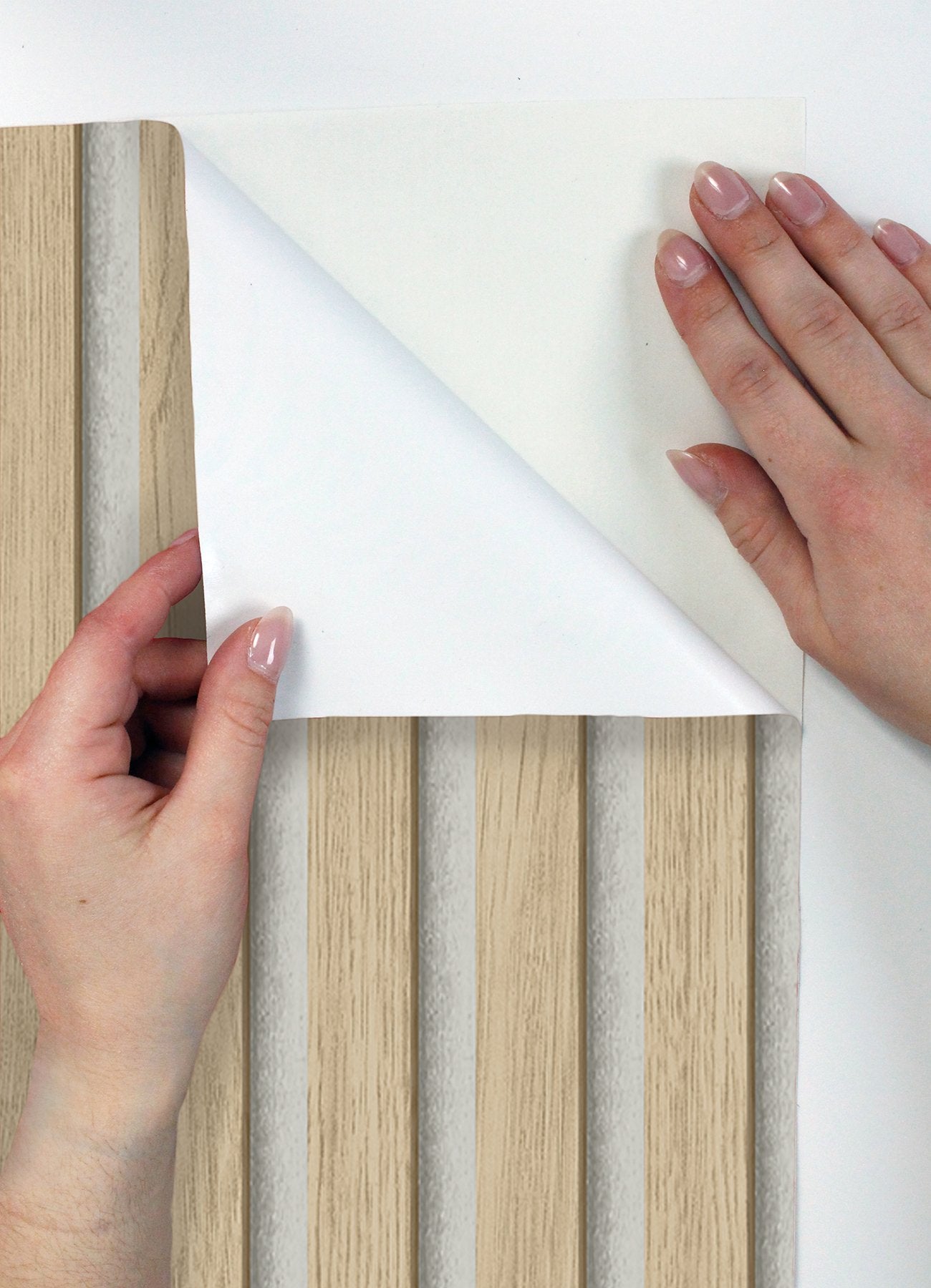 - Natural wood slat pattern on peel and stick NuWallpaper