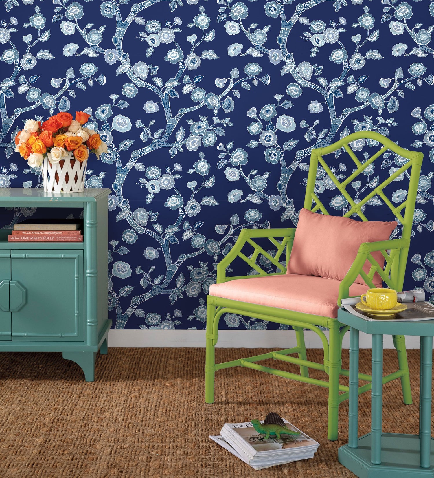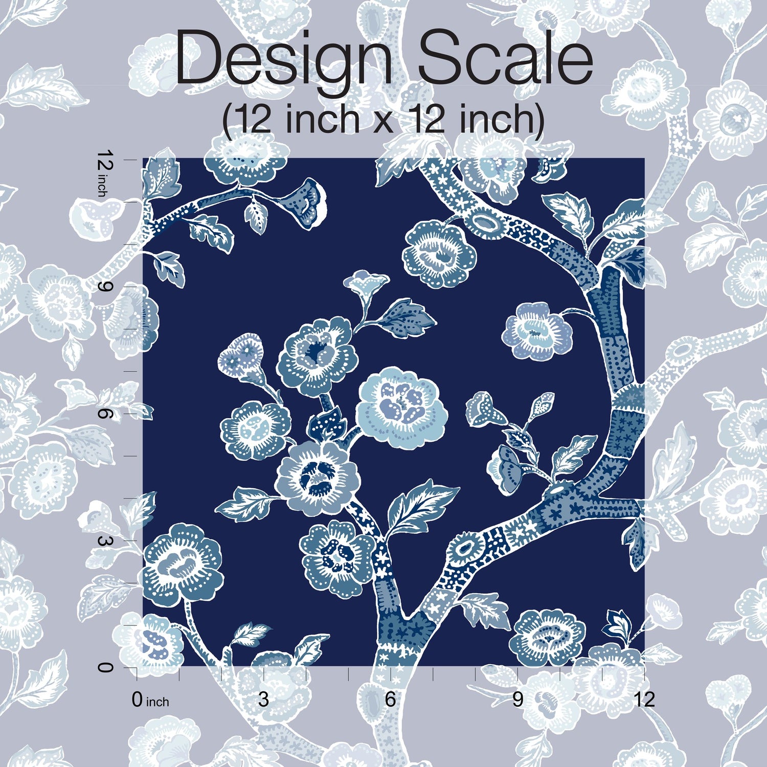 Temple Garden Navy Blue Peel & Stick Wallpaper with Botanical Floral Chinoiserie Motif - York PSW1407RL - Roll is backordered and will ship as soon as it is back in stock.