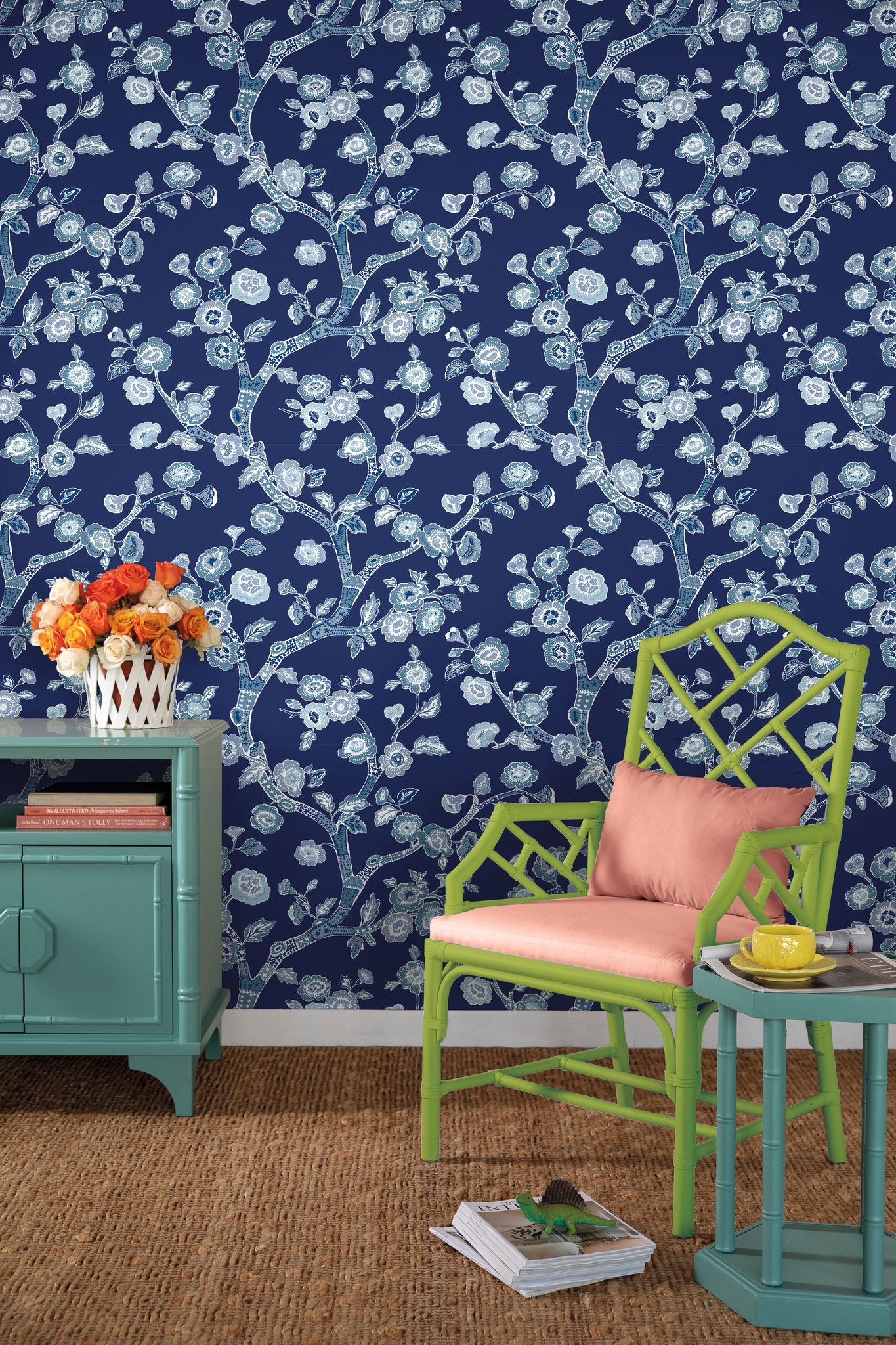 Detailed Name: Madcap Cottage Temple Garden Navy Blue Peel & Stick Wallpaper, 27-in by 20-ft