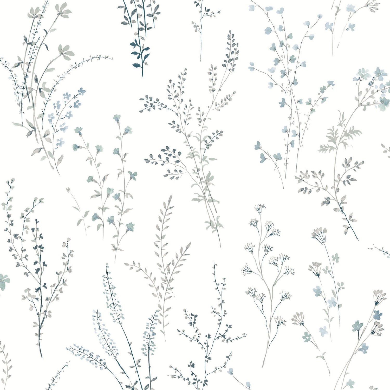 Wildflower Sprigs Blue & Green Peel & Stick Wallpaper with Watercolor Botanical Motif - York PSW1523RL - Roll is backordered and will ship as soon as it is back in stock.
