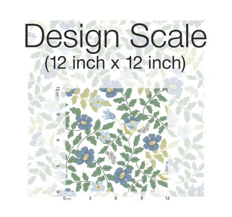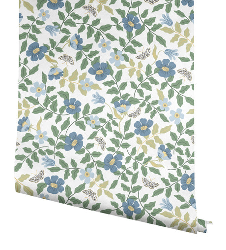 Primrose Blue & White Peel & Stick Wallpaper with Floral and Butterfly Motif - York PSW1316RL