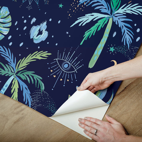 Nuit Tropicale Blue Peel & Stick Wallpaper with Bohemian Tropical Graphics - York RMK12705PLW