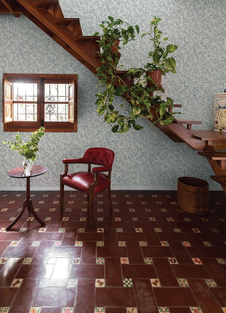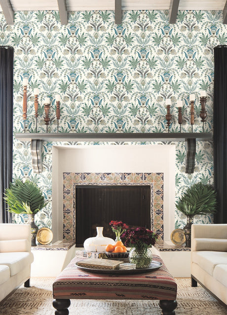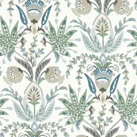 Seaside Jacobean Green & Blue Wallpaper with Mediterranean Floral Jacobean Motif - York MN1910SAM