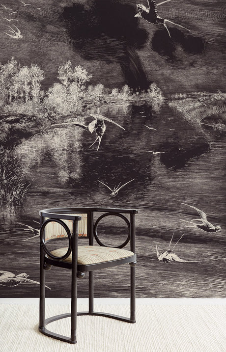 Hirundo Black Scenic Nature Wall Mural with Monochrome Birds over Lagoon - Eijffinger EJ366100