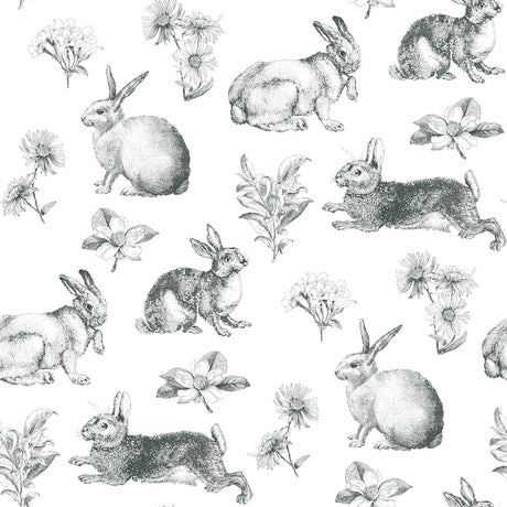 Bunny Toile Black & White Wallpaper with Toile Bunny and Floral Motif - York AT4263