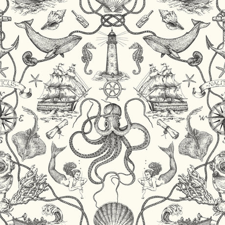 Deep Sea Toile Black Wallpaper with Nautical Mermaids, Ships & Octopus Motif - York HO3360